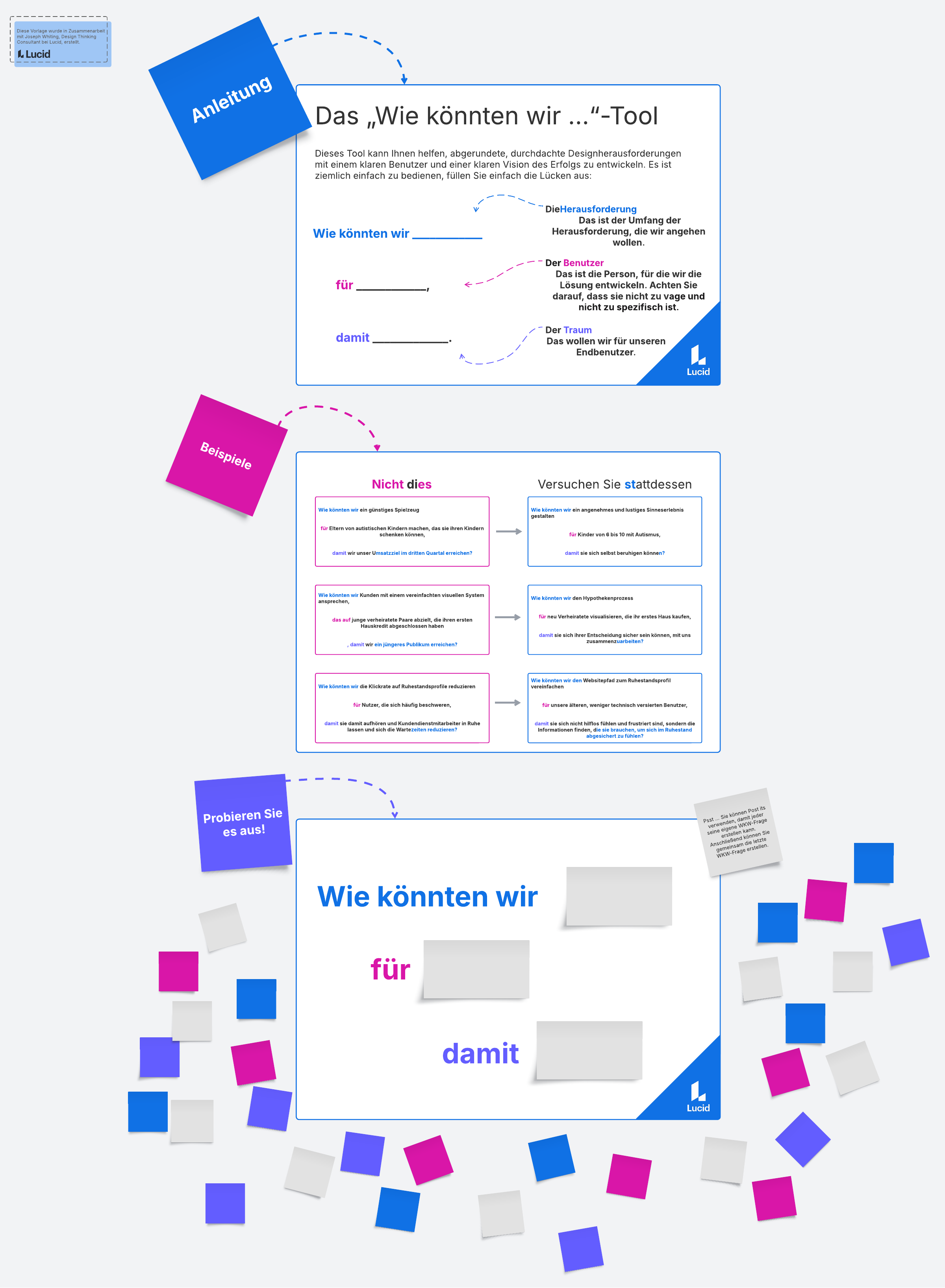 Die Frage „Wie könnten wir“ ist ein unverzichtbares Design Thinking Tool. Es sollen damit strenge und sinnvolle Design-Herausforderungsfragen erstellt werden und es wird in der Regel am Ende der Phase „Definition“ implementiert. Es kann auch als Gatekeeper-Element verwendet werden, bevor es in die Phase „Ideen“ übergeht.