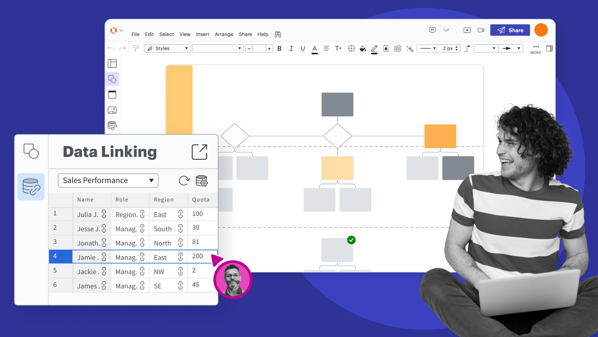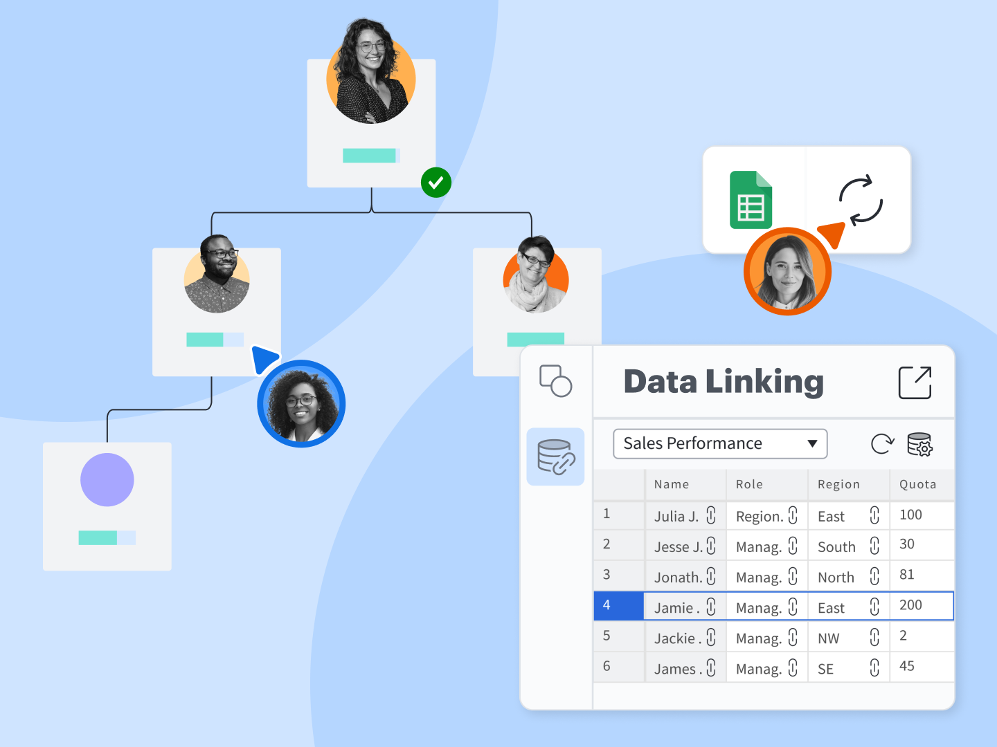Yes, if your data is linked to Google Sheets or Excel, you can refresh the org chart to sync automatically. Lucidchart's manage data feature offers refresh, replace, and overlay options to keep your chart up to date.