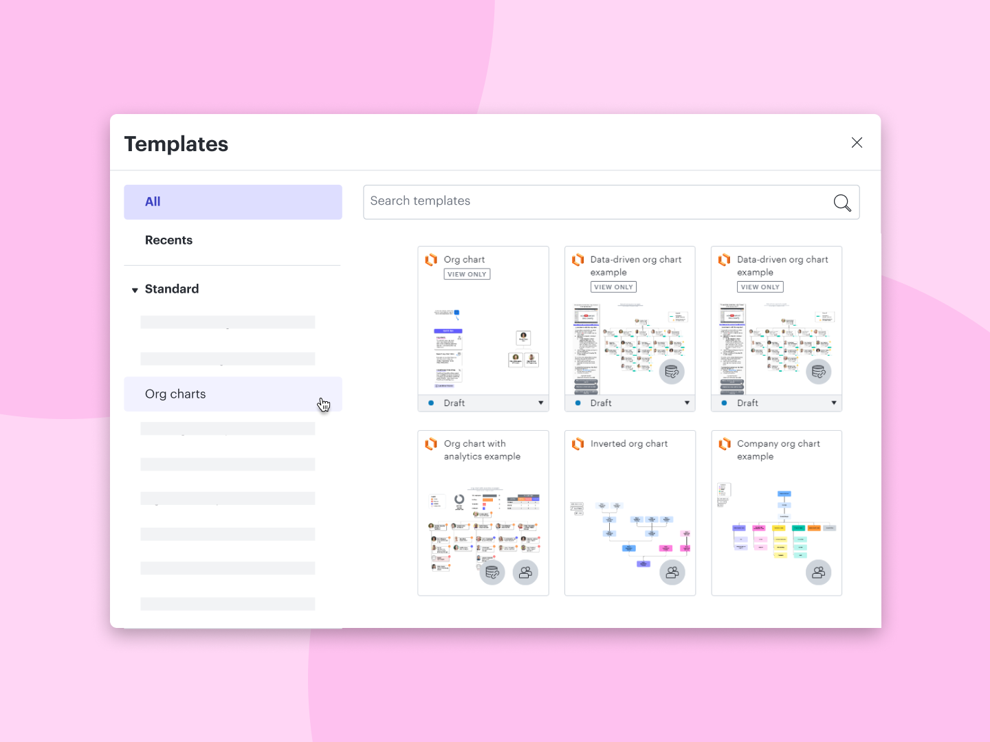Lucid offers an intuitive drag-and-drop interface with an extensive template library and AI capabilities designed to make org chart creation accessible.