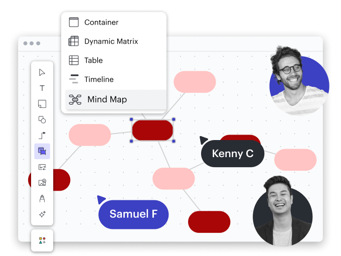 Accede fácilmente al creador de mapas mentales de Lucidspark usando la barra de herramientas de la izquierda. Con unos pocos clics, puedes agregar un mapa mental a tu tablero en cualquier momento.