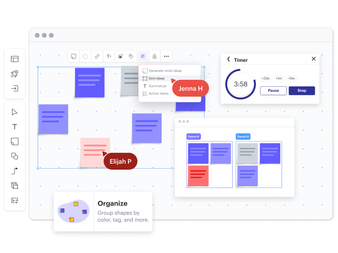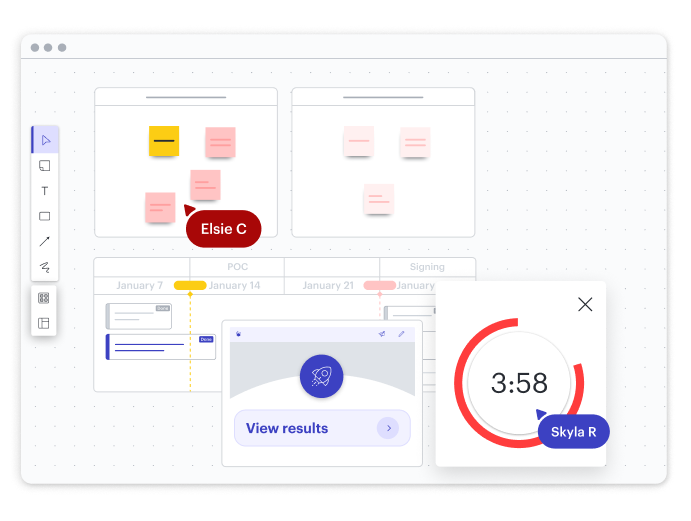 Aprovecha capacidades como actividades visuales, tableros para grupos pequeños y votación con temporizador para medir opiniones y llegar a un consenso como equipo. Logra la alineación y toma decisiones informadas más rápido.