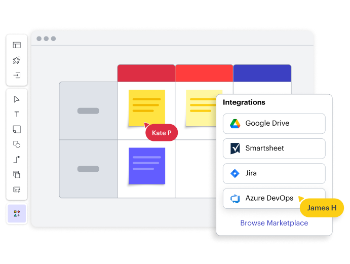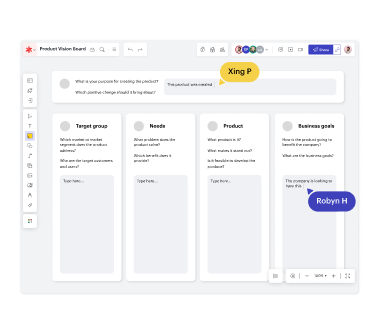 Aumenta la comprensión compartida de tu equipo con el lienzo visual de Lucidspark. Usa figuras, herramientas de dibujo a mano y texto para comunicar claramente tu mensaje.