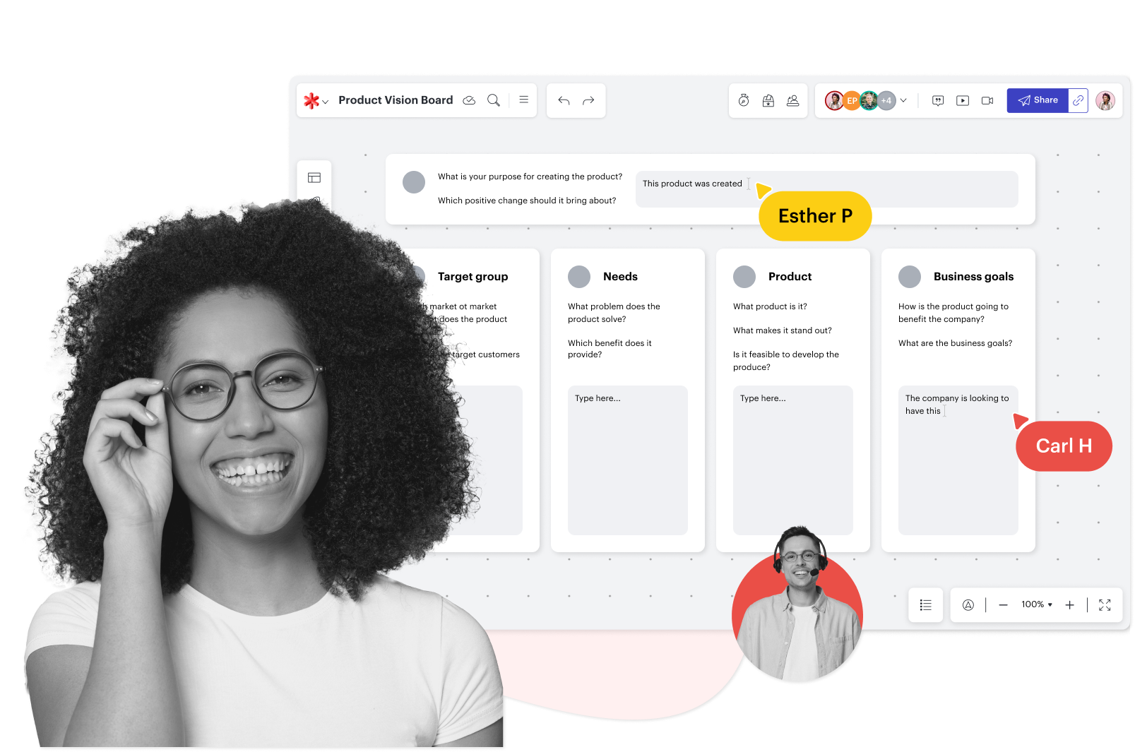 Mantén a las partes interesadas alineadas mientras exploras las necesidades y trazas el recorrido del cliente. Usa funciones como estas:
