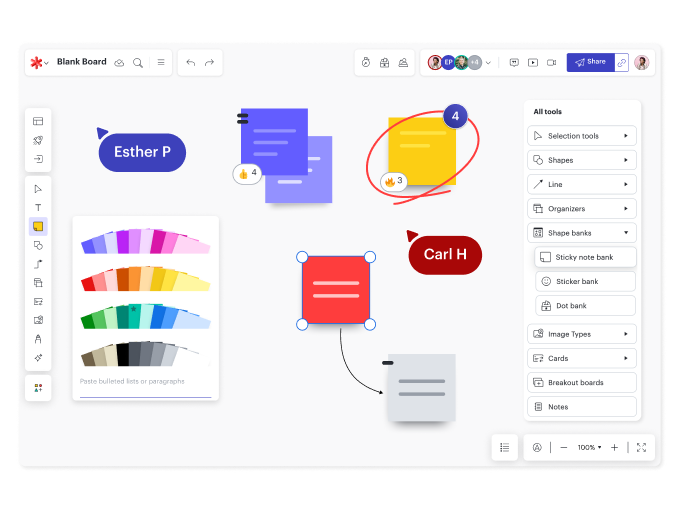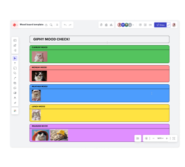 Facilita sesiones de ideación más productivas con nuestro creador de mood boards. Reúne a tu equipo en tiempo real o en cualquier momento para compartir ideas, tomar decisiones e identificar los próximos pasos.