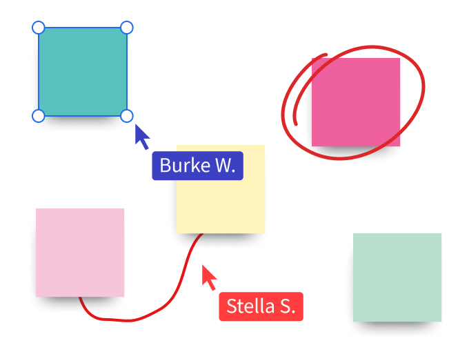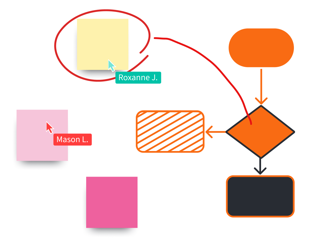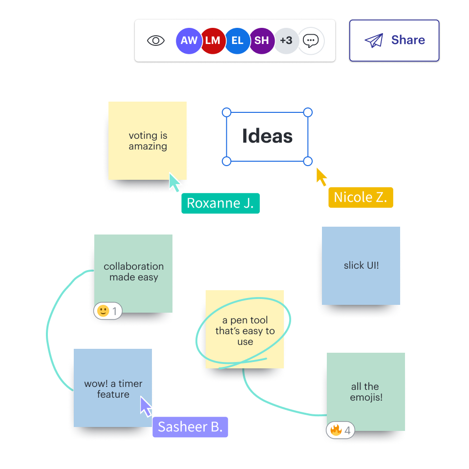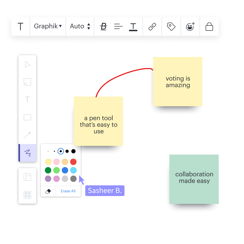 En nuestra pizarra virtual, tendrás todo lo que necesitas para transformar tus ideas rápidamente, desde notas adhesivas hasta dibujos a mano. Lo único que le falta es el olor de los marcadores.