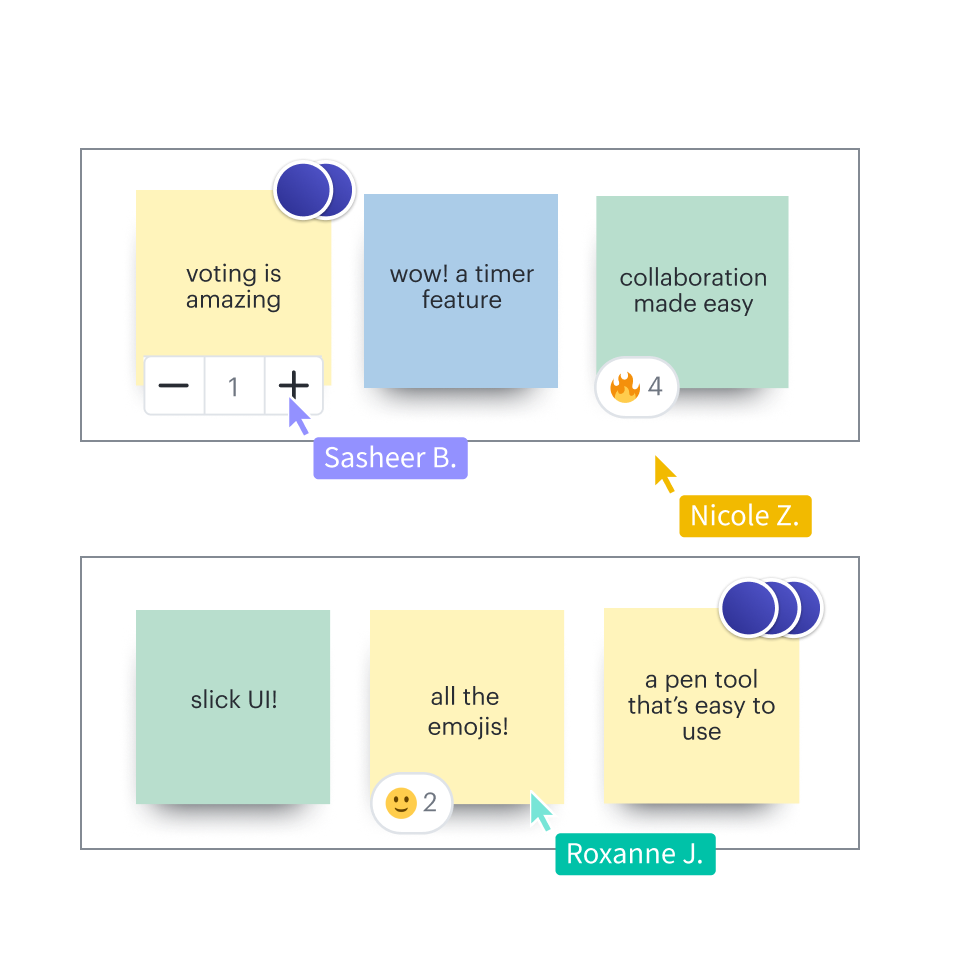 Usa el modo votación y la agrupación asistida (o incluso invita a otros a tu vista) para encontrar patrones, identificar tus mejores opciones y decidir los próximos pasos en el equipo.