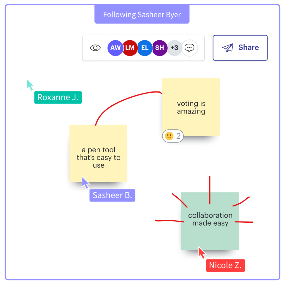 Dos (o 20) cabezas son mejor que una. Varios participantes pueden unirse y aportar ideas en tu tablero en tiempo real: usa @mention para llamar la atención de los integrantes de tu equipo, reacciona con emojis y sigue a tus colaboradores para trabajar en conjunto con facilidad.
