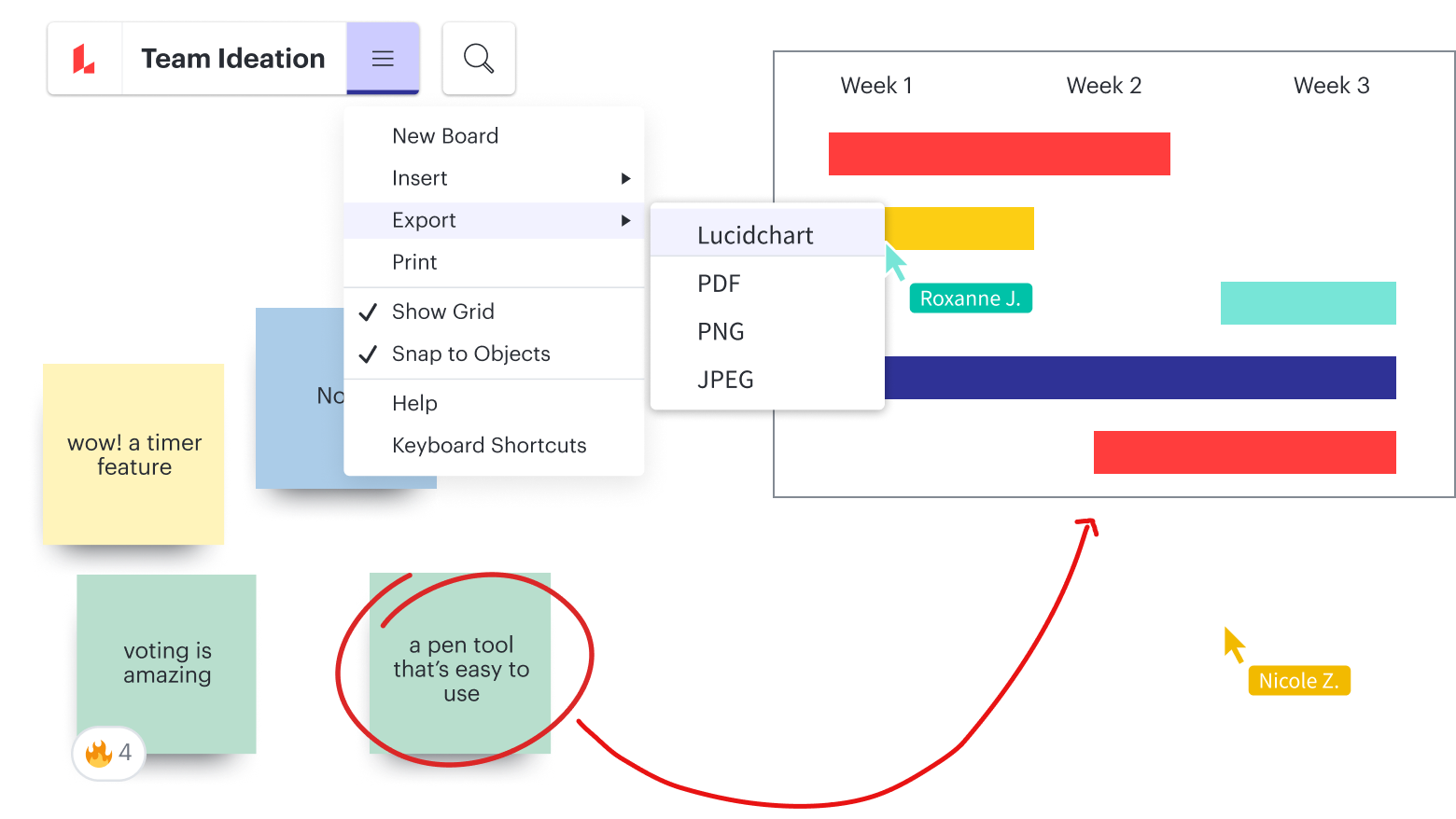 Transforma tus ideas en acciones para que la innovación no pierda el ritmo. Exporta tus tableros de Lucidspark a Lucidchart para crear documentos más pulidos que los equipos pueden consultar y compartir ampliamente cuando ejecutan proyectos y procesos.