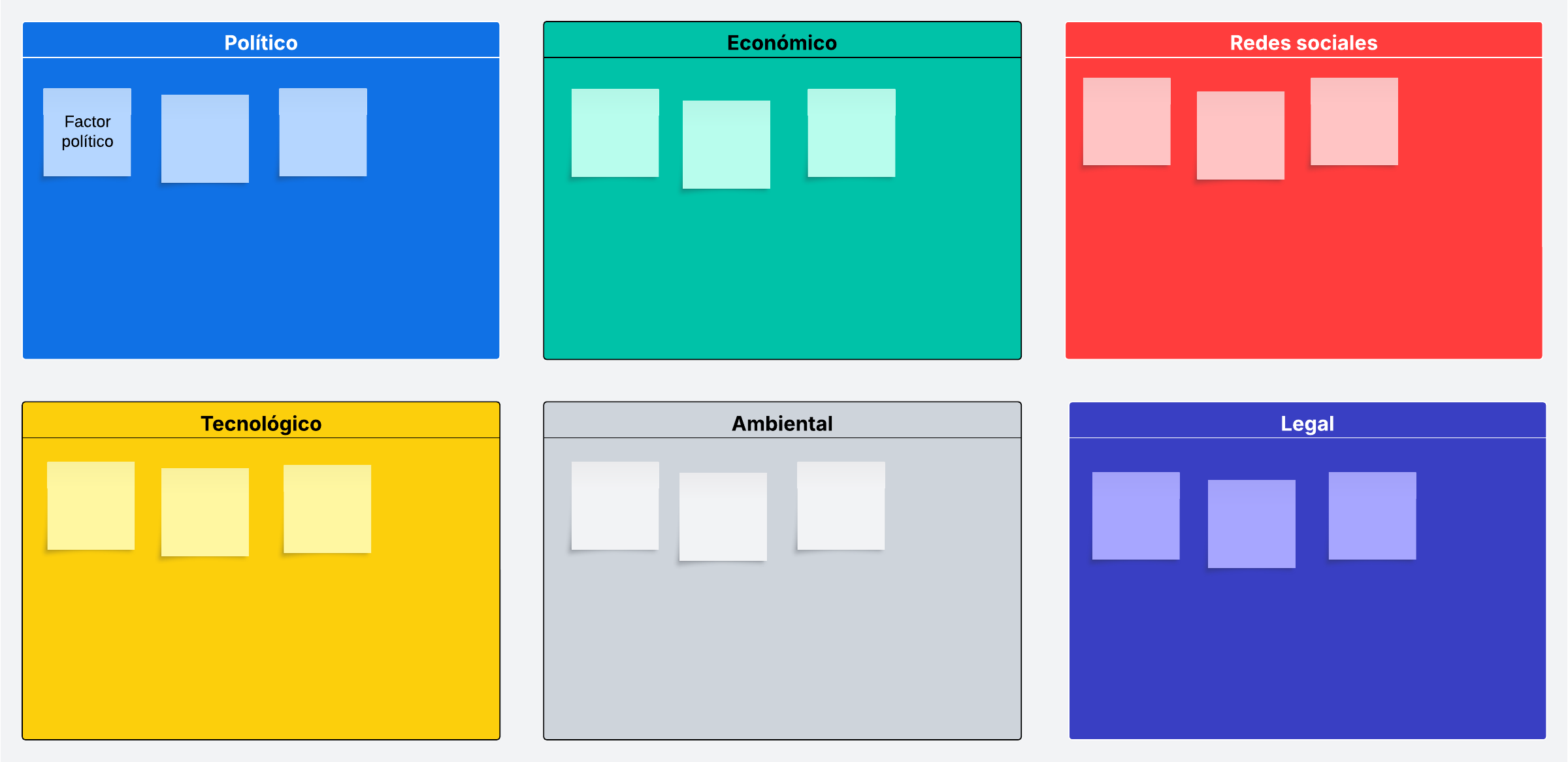 La plantilla de PESTEL de Lucidspark está prediseñada con seis contenedores, en los que se enumeran las seis categorías de factores externos.