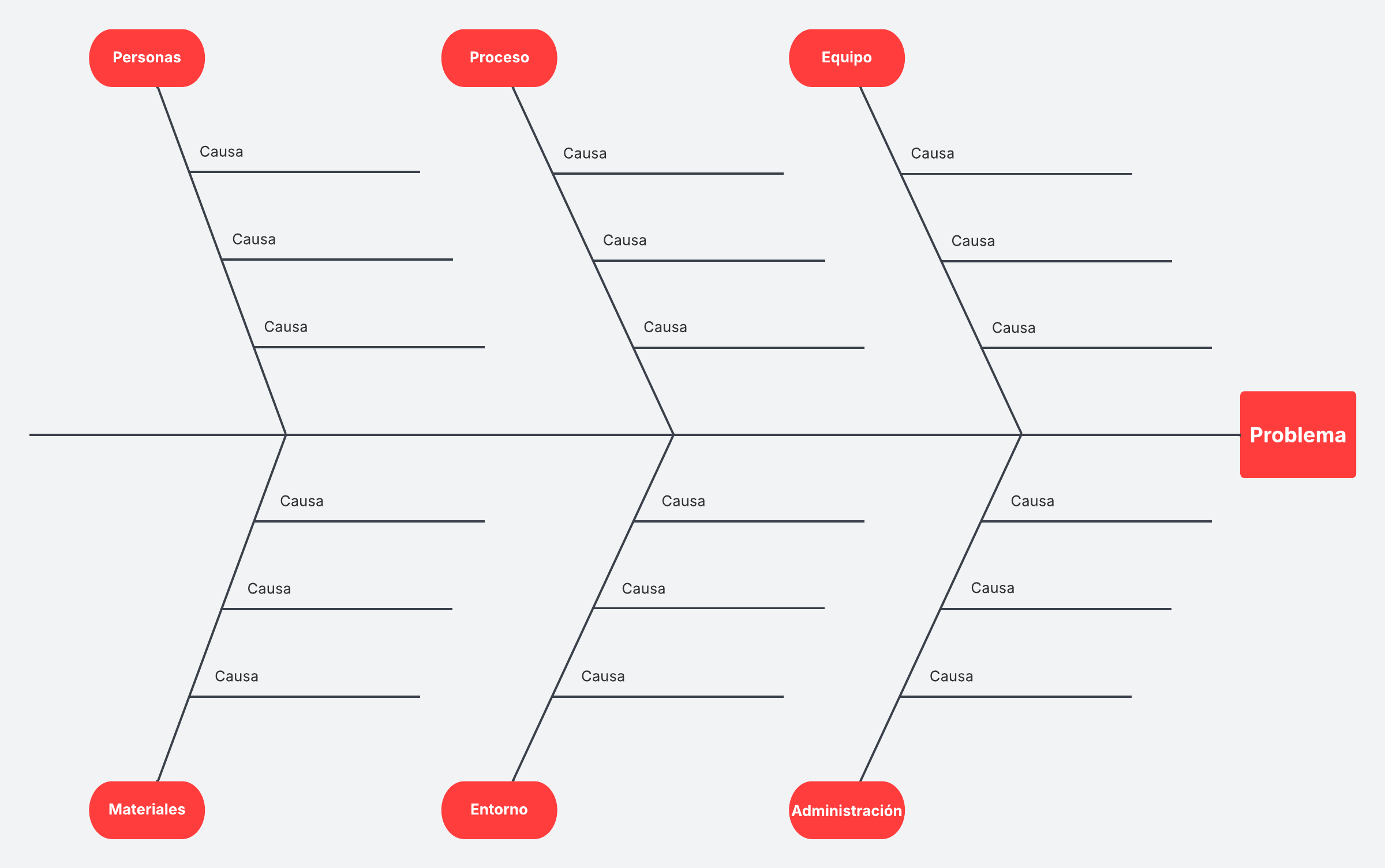 Cuando se debate el problema con un grupo, es posible que la conversación se desvíe o se quede en una sola causa posible. Esta plantilla de diagrama de espina de pescado para llenar te mantiene enfocado y te ayuda a considerar diferentes posibilidades.