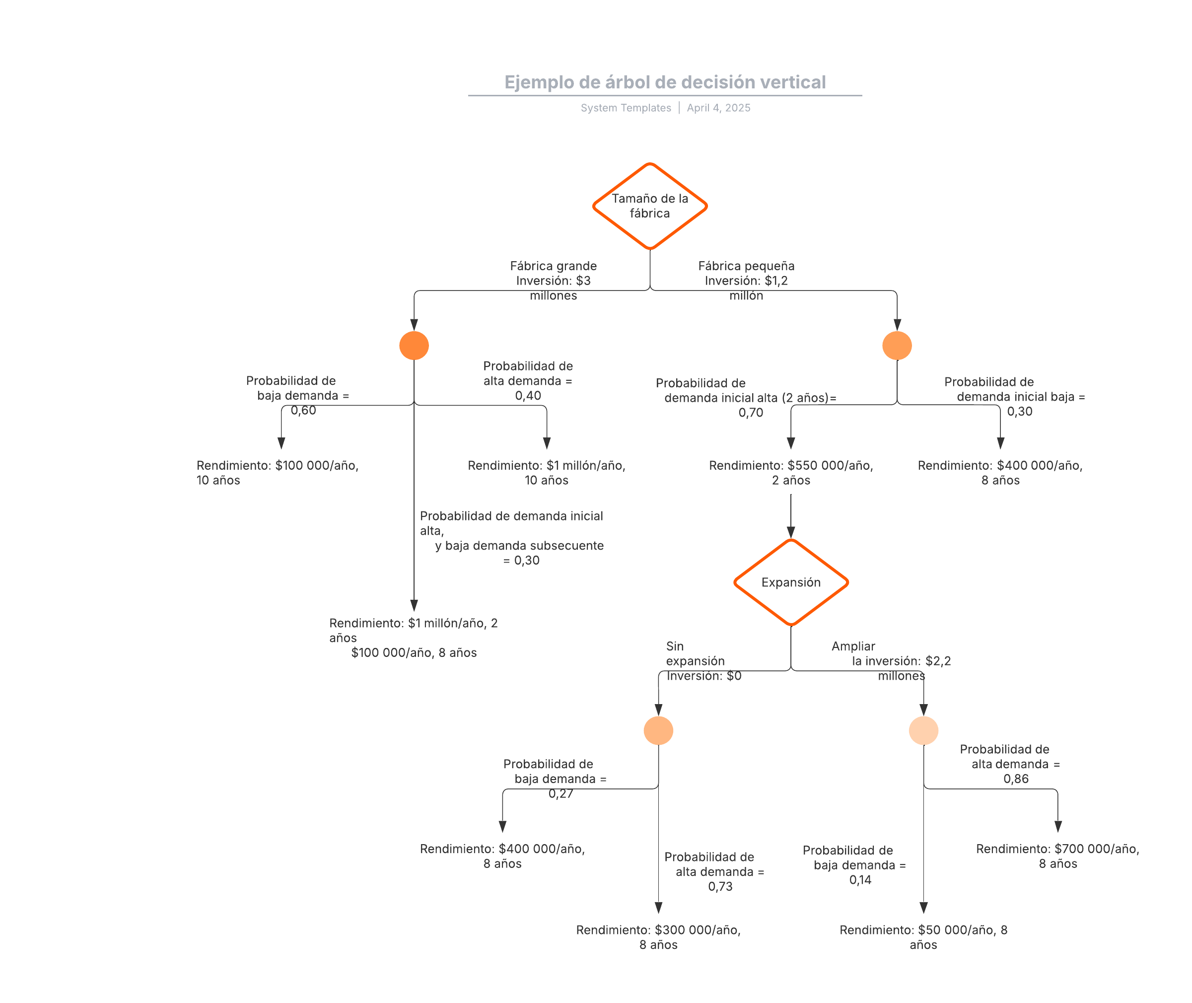 Abre esta plantilla para ver un ejemplo detallado de un árbol de decisiones vertical con datos que puedes personalizar según tu caso de uso.