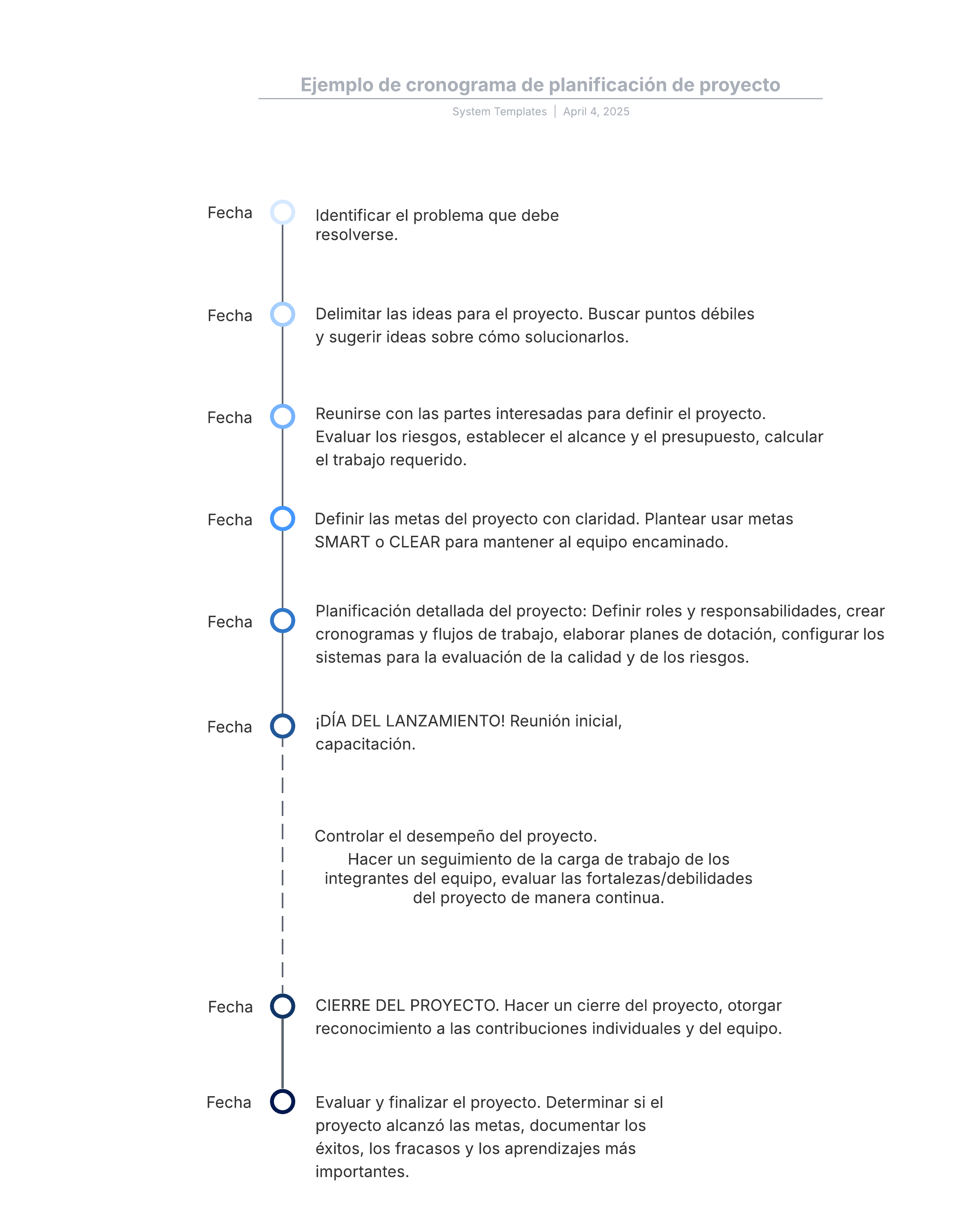 Abre esta plantilla para ver un ejemplo detallado de un cronograma de planificación de un proyecto que puedes personalizar según tu caso de uso.