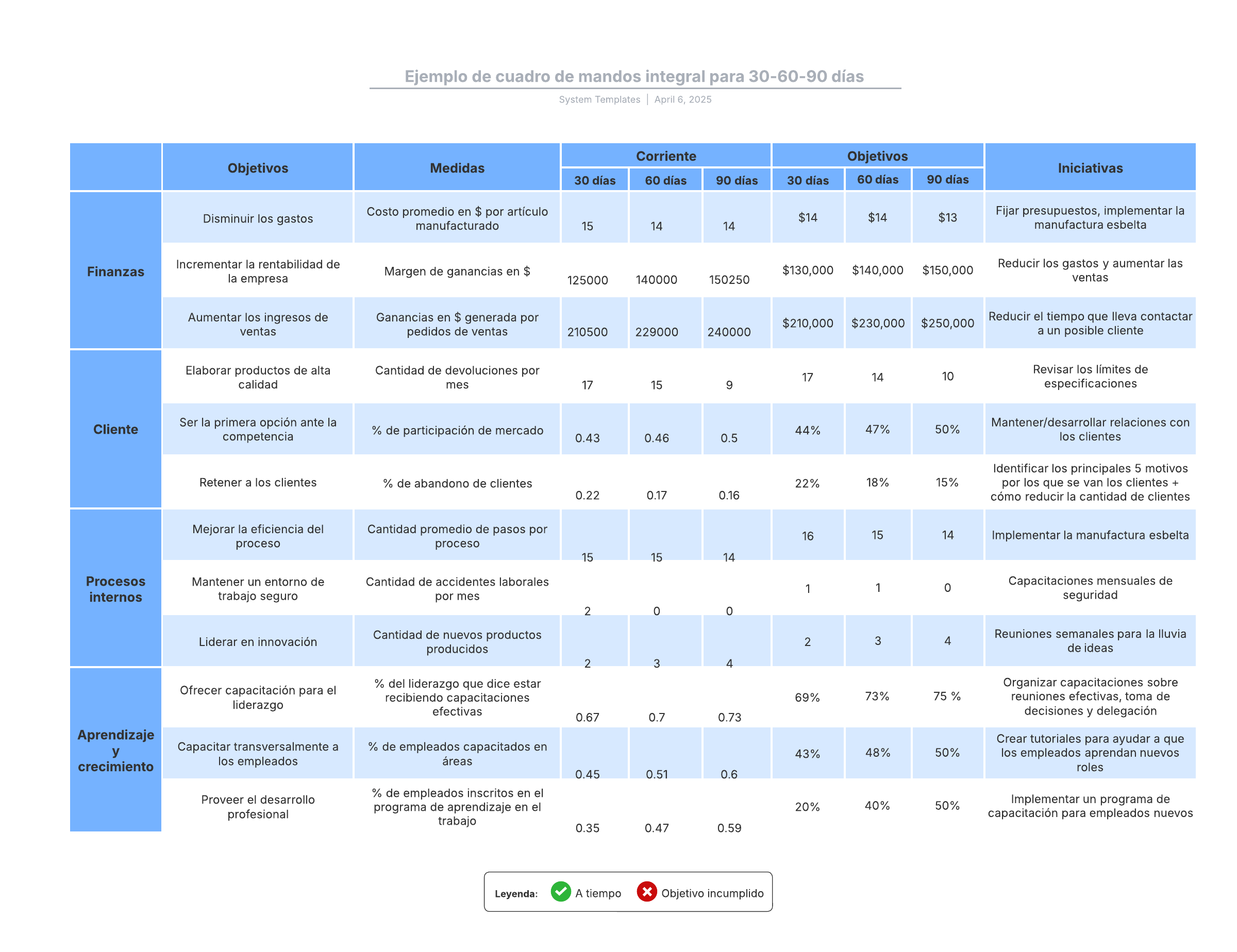 Ejemplo de cuadro de mandos integral para 30-60-90 días