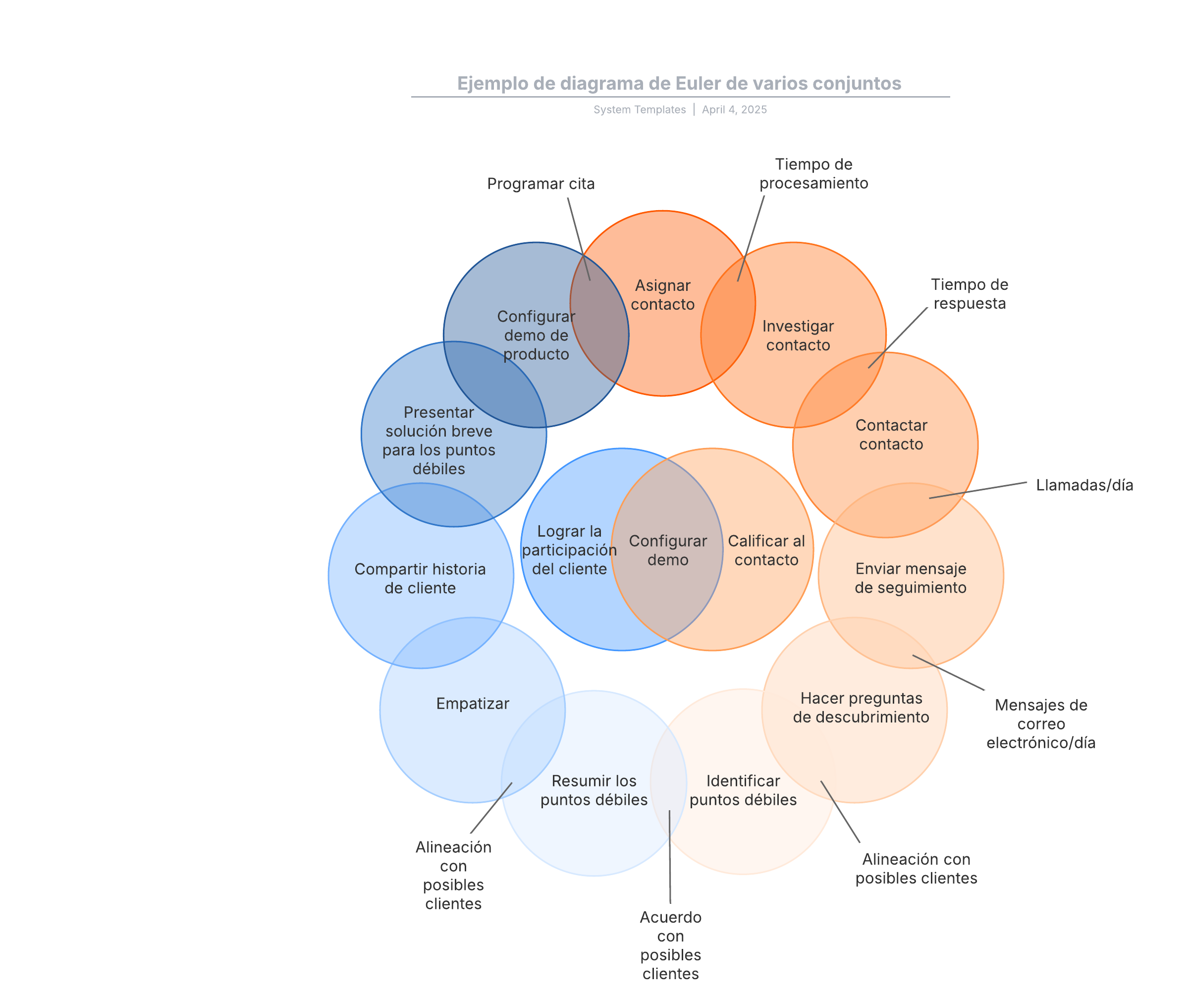 Abre esta plantilla para ver un ejemplo detallado de un diagrama de Euler de varios conjuntos que puedes personalizar según tu caso de uso.