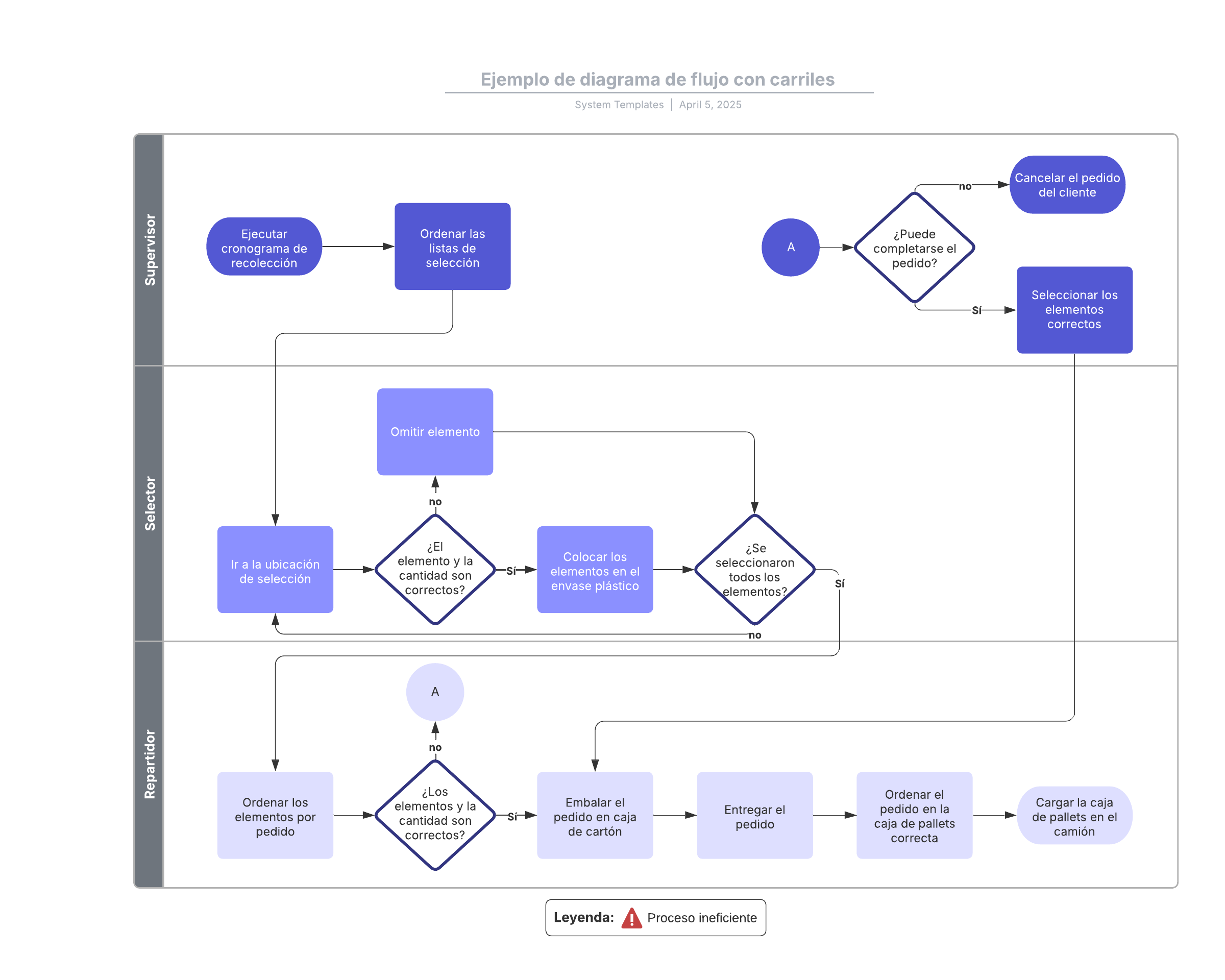 Abre esta plantilla para ver un ejemplo detallado de un diagrama de flujo con carriles que puedes personalizar según tu caso de uso.