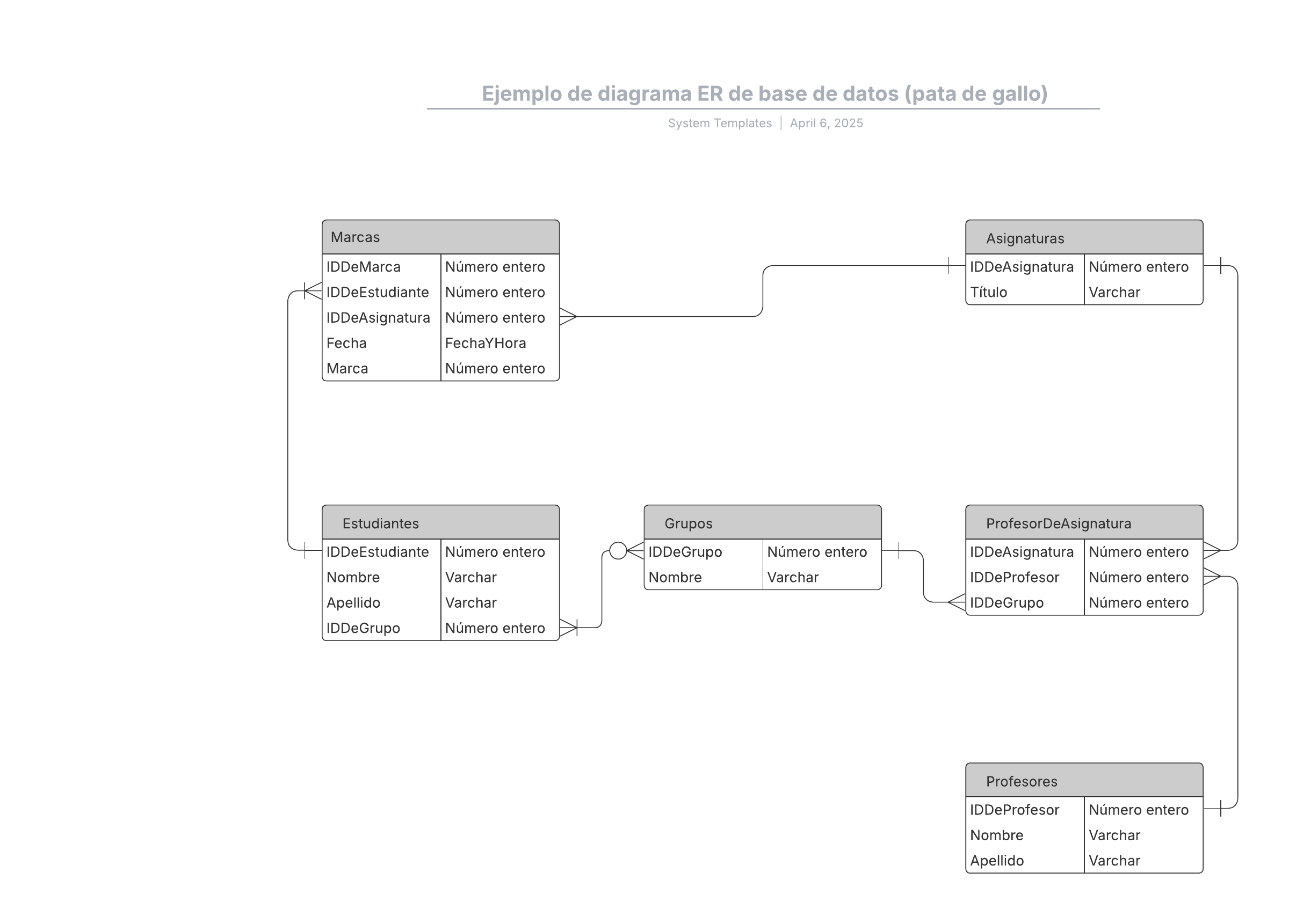 Abre esta plantilla para ver un ejemplo detallado de un diagrama ER de base de datos que puedes personalizar según tu caso de uso.