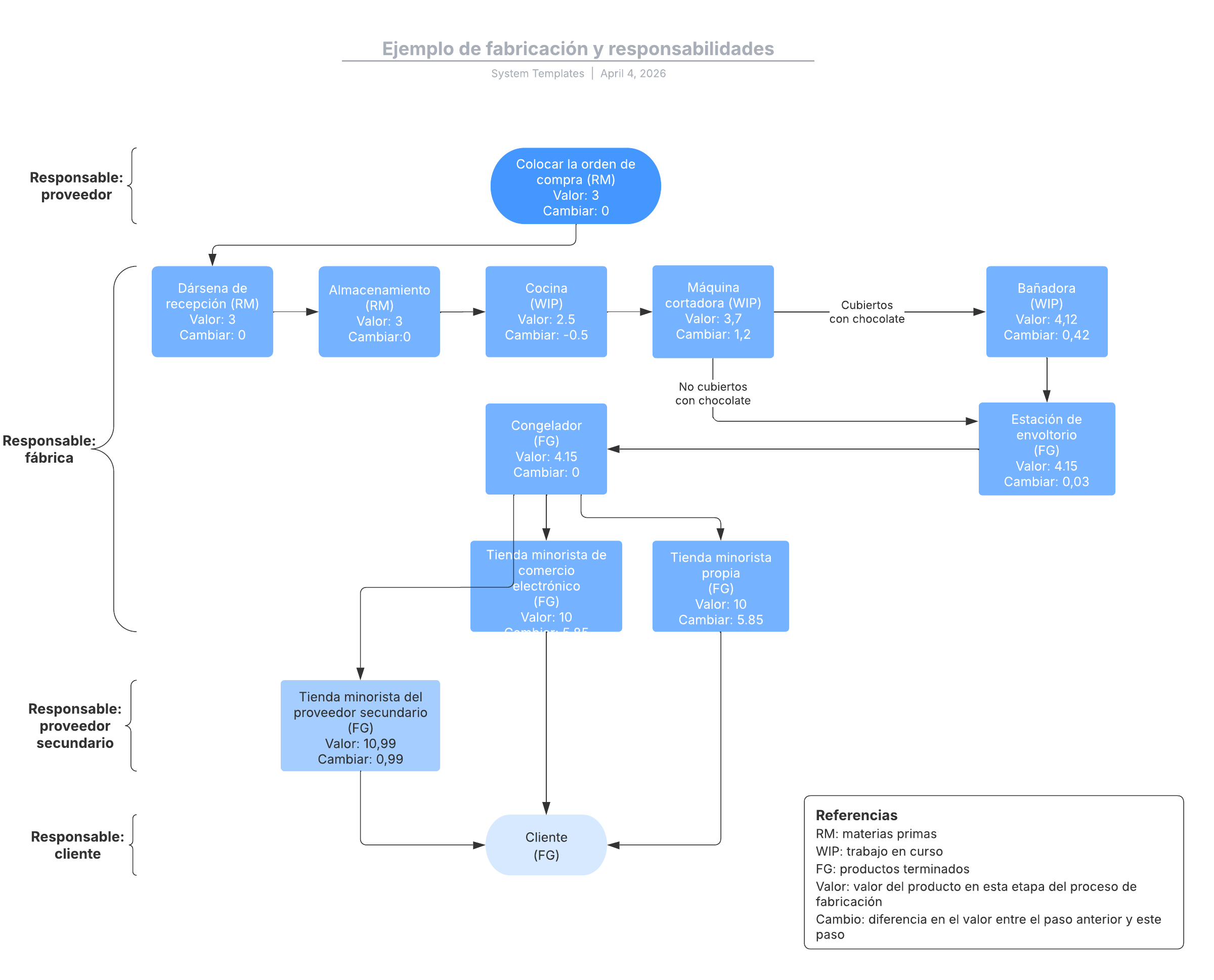 Abre esta plantilla para ver un ejemplo detallado de un diagrama de flujo de fabricación y responsabilidades que puedes personalizar según tu caso de uso.
