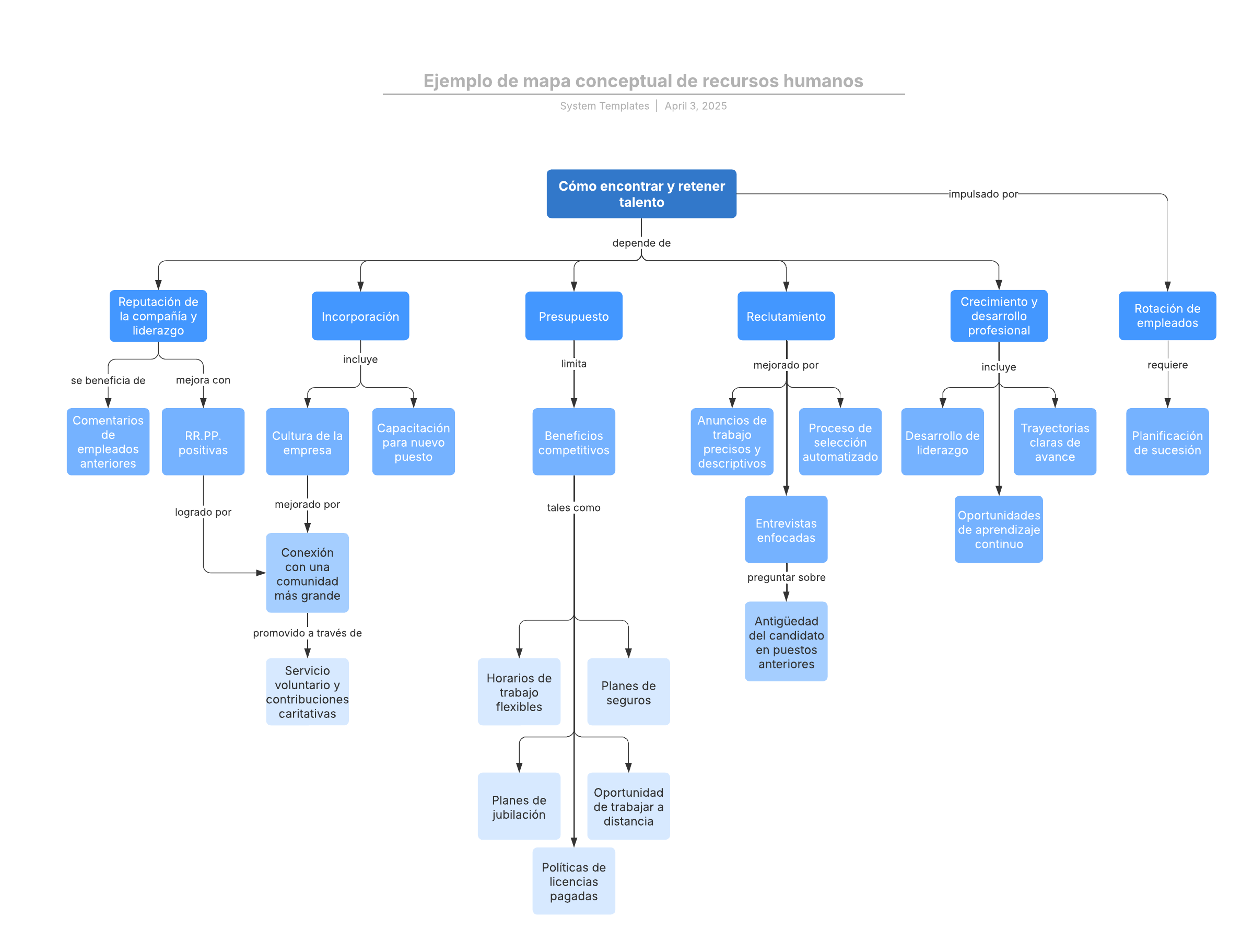 Abre esta plantilla para ver un ejemplo detallado de un mapa conceptual de recursos humanos que puedes personalizar según tu caso de uso.