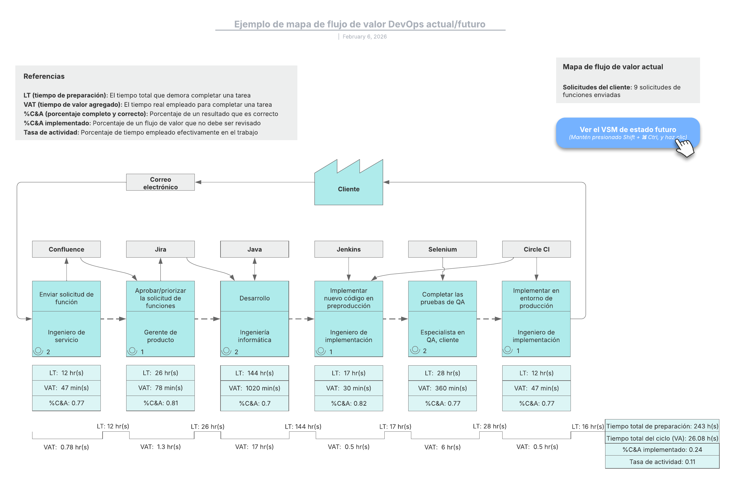 Abre esta plantilla para ver un ejemplo detallado de un mapa de flujo de valor actual/futuro de DevOps que puedes personalizar según tu caso de uso.