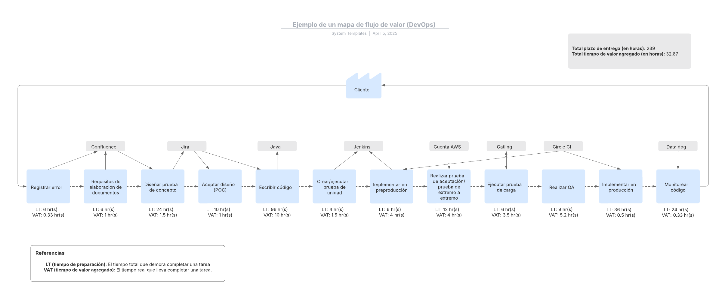 Abre esta plantilla para ver un ejemplo detallado de un mapa de flujo de valor (DevOps) que puedes personalizar según tu caso de uso.