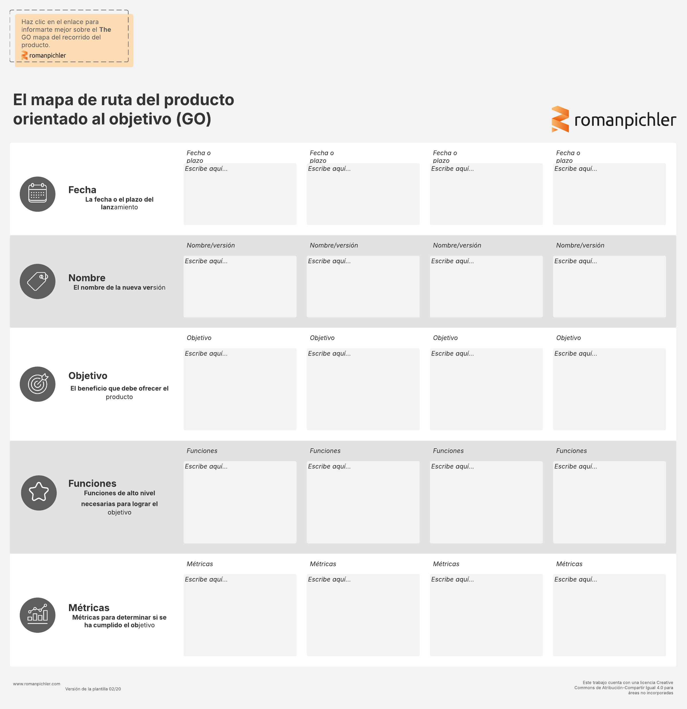 Usa el mapa de ruta del producto GO, creado originalmente por el experto en gestión de productos Roman Pichler, para describir los objetivos que debe alcanzar tu producto e informar a las partes interesadas. Este mapa de ruta está orientada a los objetivos, por lo que las conversaciones pasan de debatir las características a acordar los resultados y beneficios deseados.