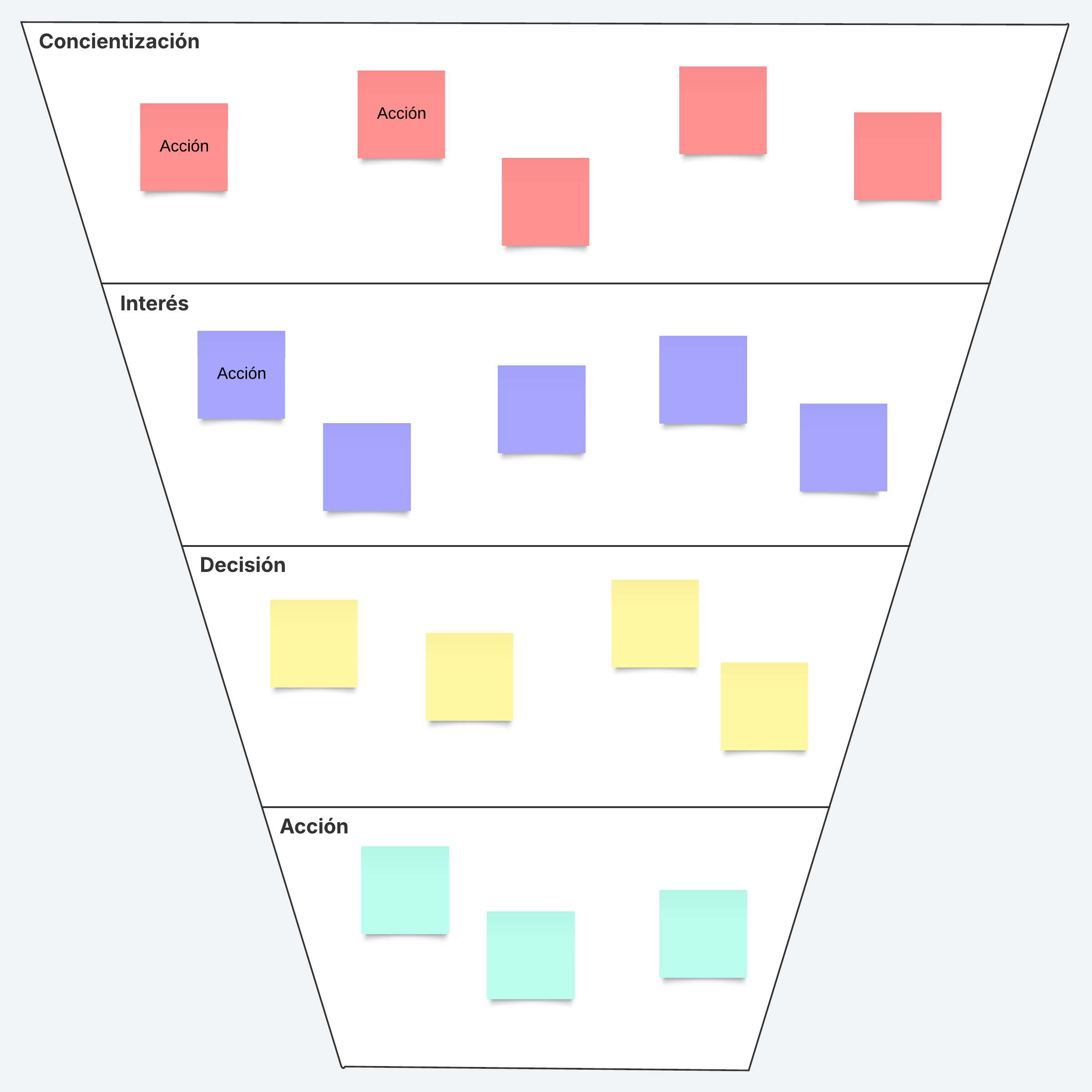 Crea un embudo de conversión para visualizar el recorrido de tu cliente, desde la primera vez que conoce tu marca hasta que, eventualmente, compra un producto o servicio. Este ejercicio te permitirá comprender las mejores formas de guiar a los clientes en cada paso del proceso de conversión.