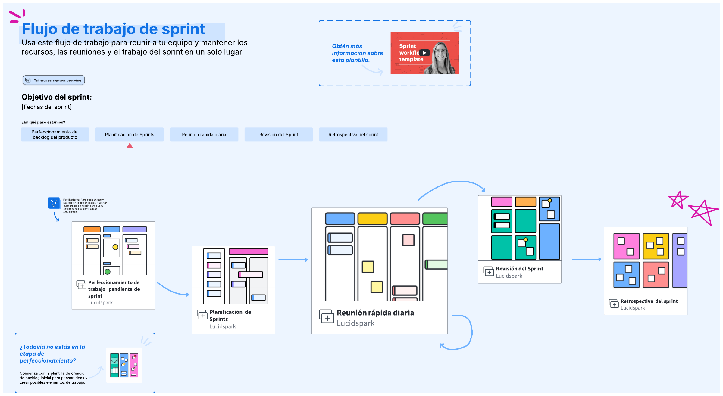 Optimiza todos los eventos Agile de tu sprint convenientemente alojados en un solo lugar con esta plantilla. Está preconfigurada para ayudarte con el perfeccionamiento de tu backlog del producto, la estimación de sprints, la planificación de sprints, las reuniones rápidas diarias, la revisión de sprints y la retrospectiva en un solo tablero.