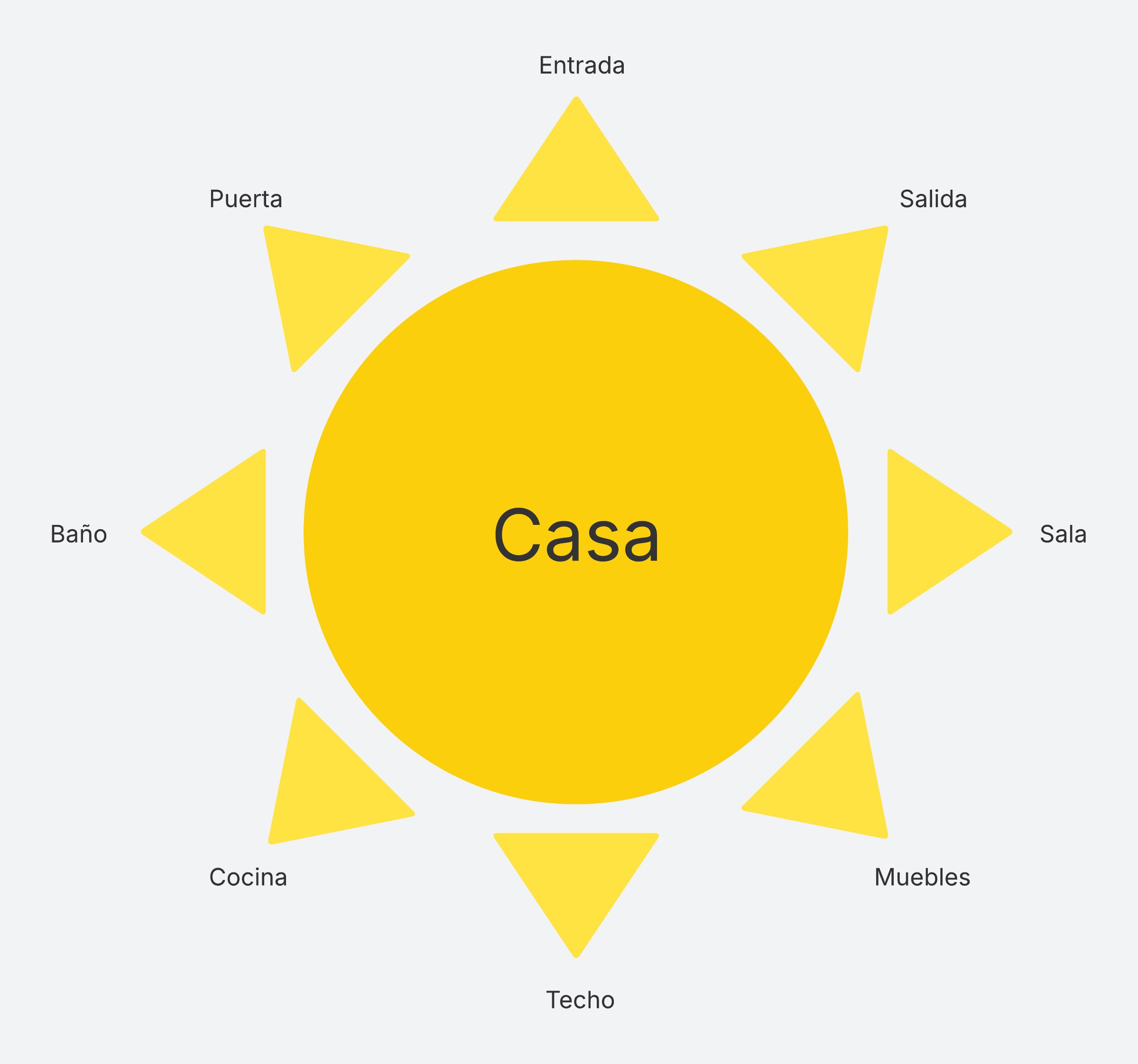 El mapa cognitivo de sol se conforma por un círculo en el centro del mapa con el tema principal, y por triángulos alrededor del círculo representando los rayos del sol. Frente a estos triángulos se encuentran diferentes subtemas que ayudan a la comprensión del tema central.