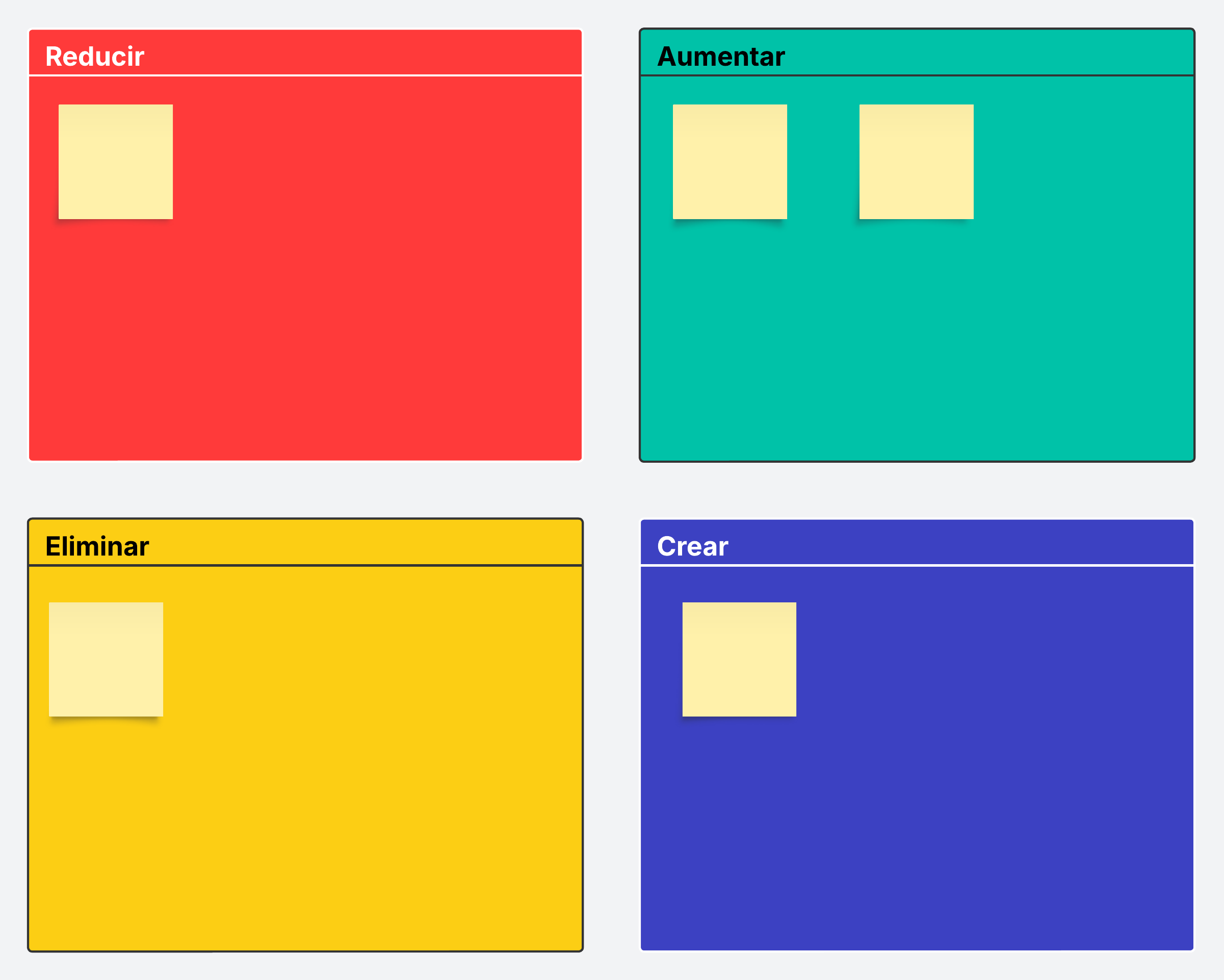 Evalúa cómo estás invirtiendo tu presupuesto para poder detectar oportunidades de maximizar las ganancias de los usuarios y minimizar los puntos débiles de los usuarios. Usa el marco de cuatro acciones para responder las preguntas clave sobre qué elementos del producto deberían eliminarse, reducirse, aumentarse y crearse.