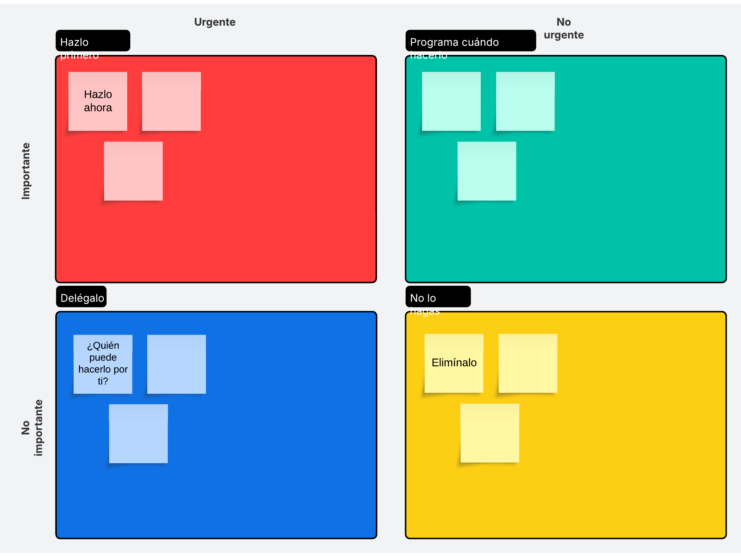 Prioriza las tareas con la matriz de Eisenhower. Organiza las tareas por urgencia e importancia para aclarar qué tareas deben hacerse ahora, cuáles pueden esperar y cuáles pueden delegarse.