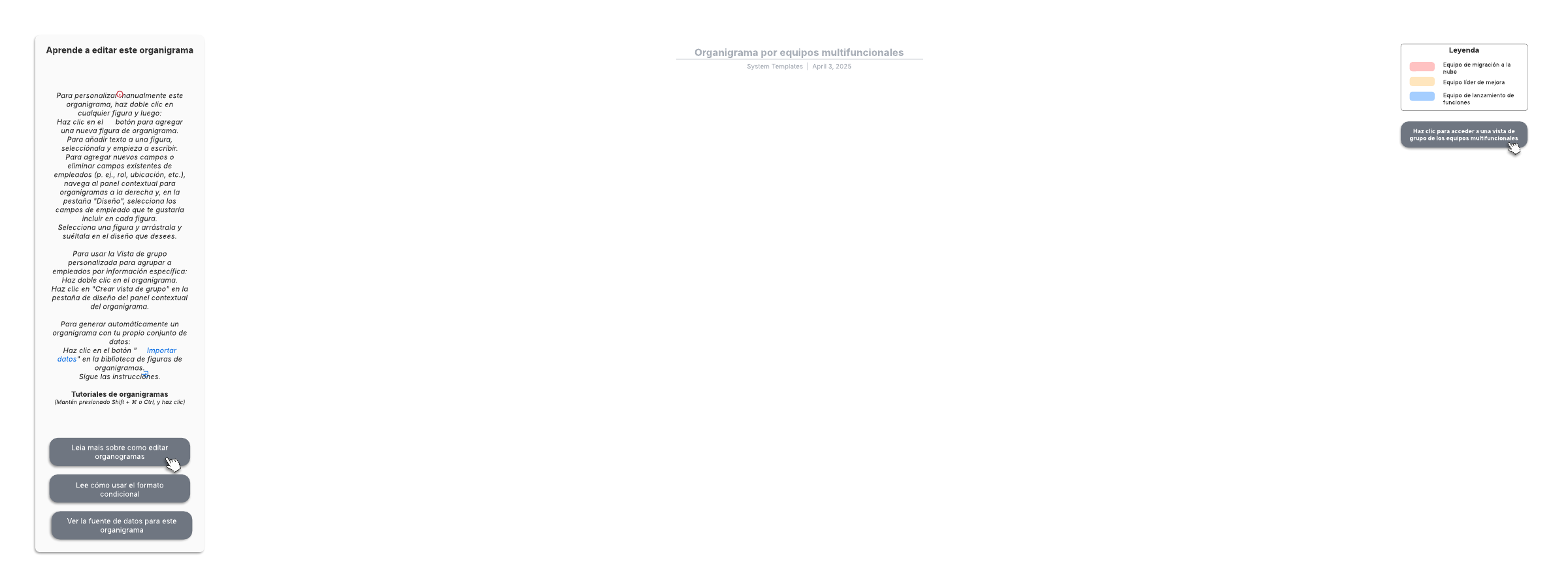 Abre esta plantilla para ver un ejemplo detallado de un organigrama por equipos multifuncionales que puedes personalizar según tu caso de uso.