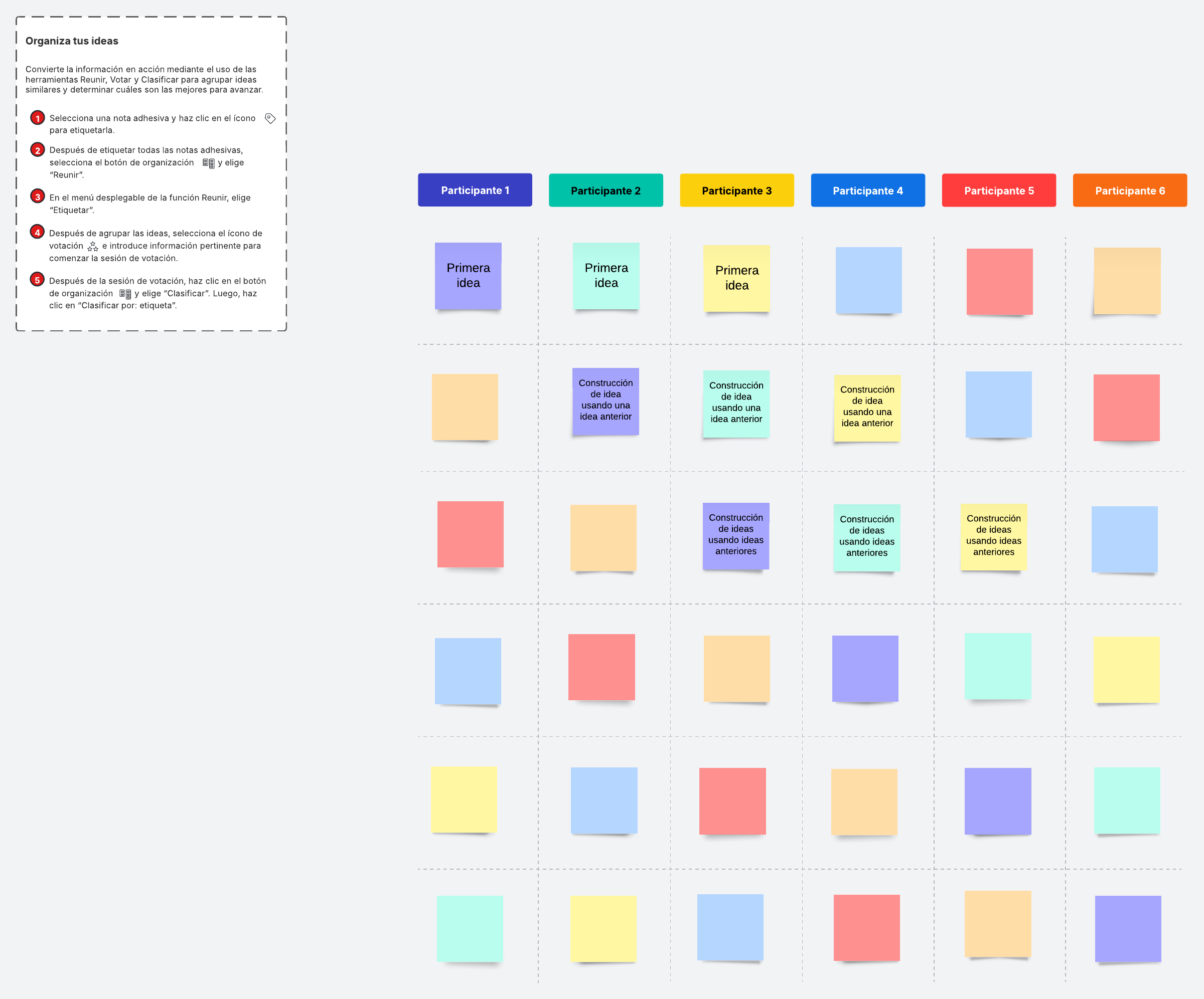 Genera ideas creativas de forma online y efectiva. Con esta plantilla de lluvia de ideas, es fácil hacer que cada integrante del equipo contribuya con sus pensamientos. Simplemente añade tus ideas, compártelas y utiliza el ejemplo incluido para iniciar sesiones productivas que inspiren más soluciones.