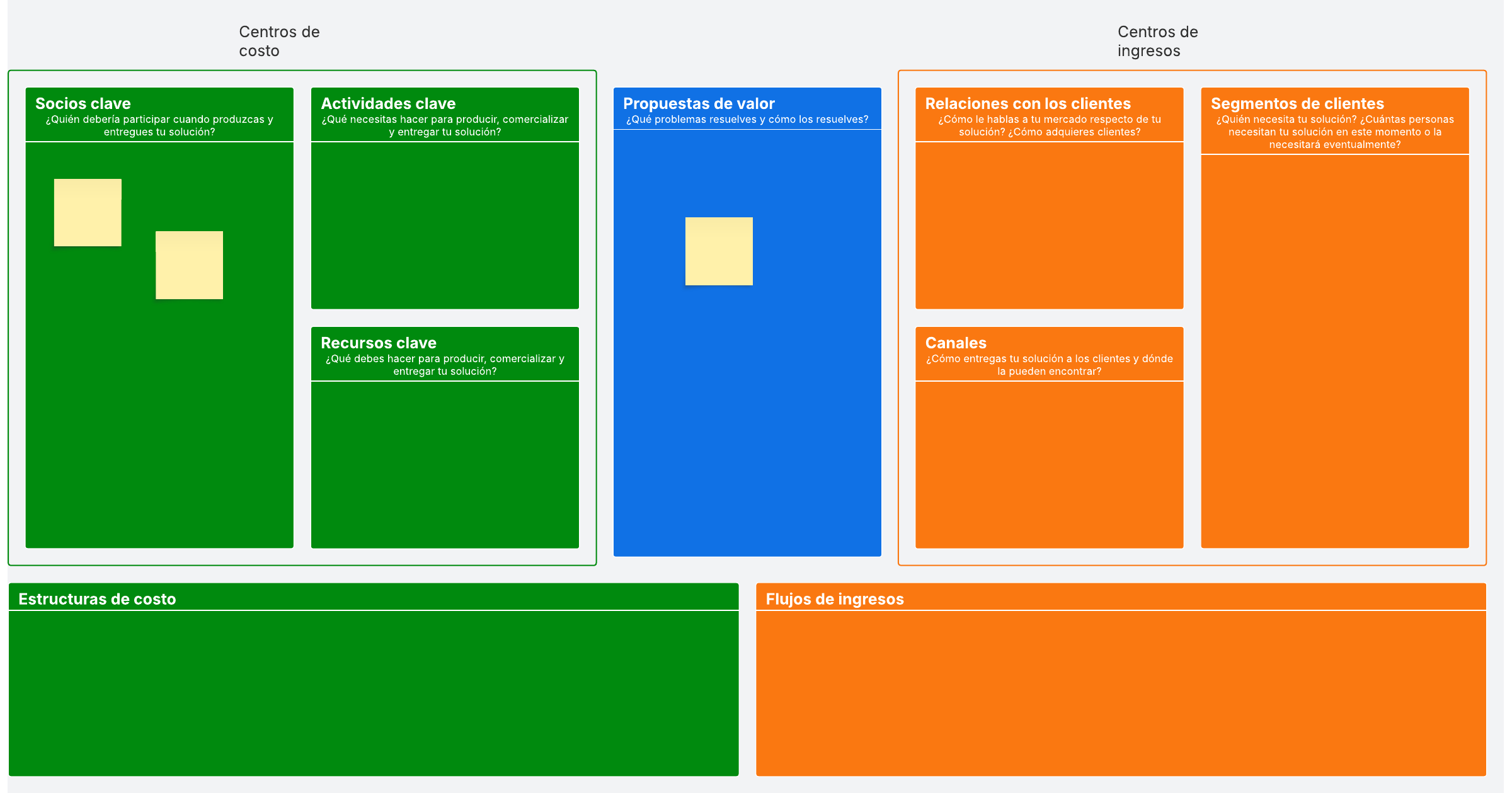 Limita tu planificación estratégica a una sola página. Crea un lienzo con el modelo de negocio para resumir rápidamente tu propuesta de valor, los segmentos de los clientes, la estructura de costos, las fuentes de ingresos y otra información clave.