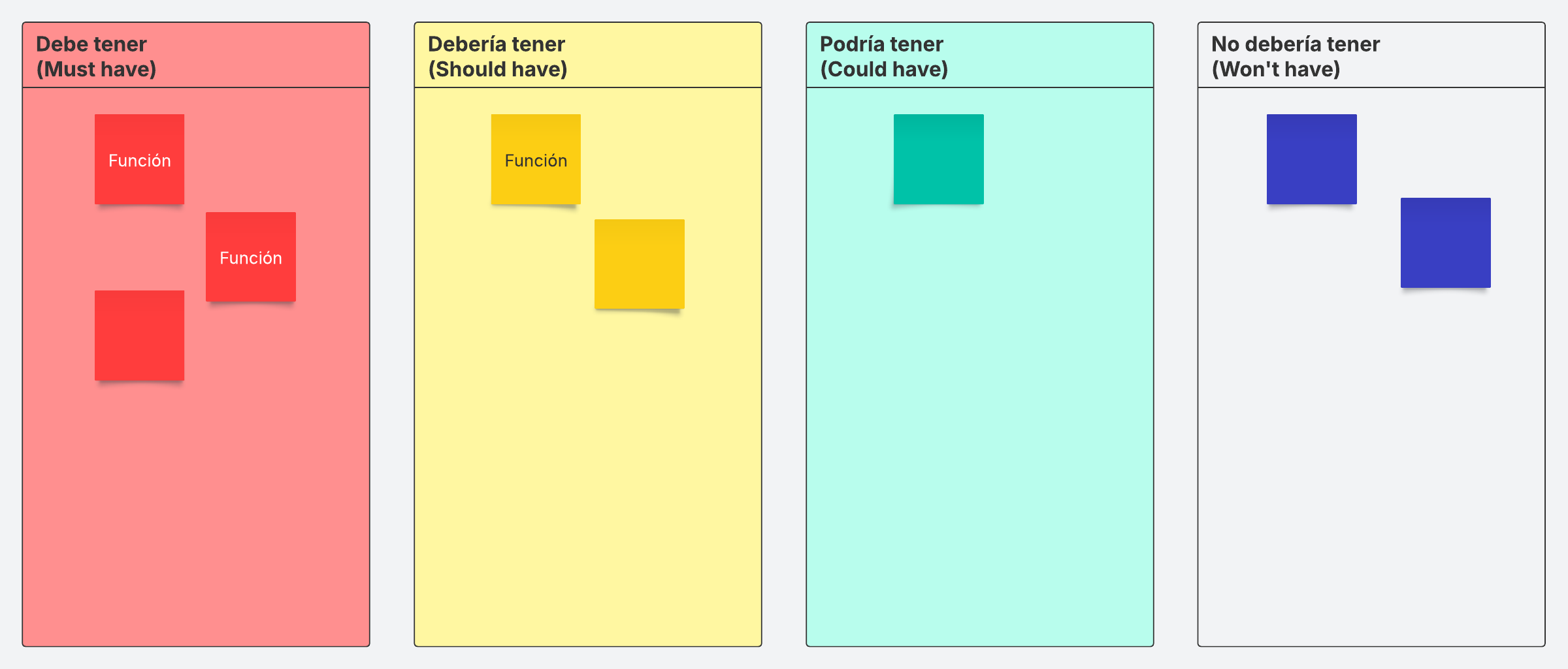 Prueba el método MoSCoW para priorizar estratégicamente las iniciativas y las funciones. Organiza las iniciativas en una de cuatro posibles categorías: Must Have (Debe tener), Should Have (Debería tener), Could Have (Podría tener) o Won't Have (No debería tener). Una vez que sepas qué funciones son las más valiosas, puedes priorizar la implementación. MoSCoW es un acrónimo en inglés y significa Must Have (Debe tener), Should Have (Debería tener), Could Have (Podría tener) y Won't Have (No debería tener).