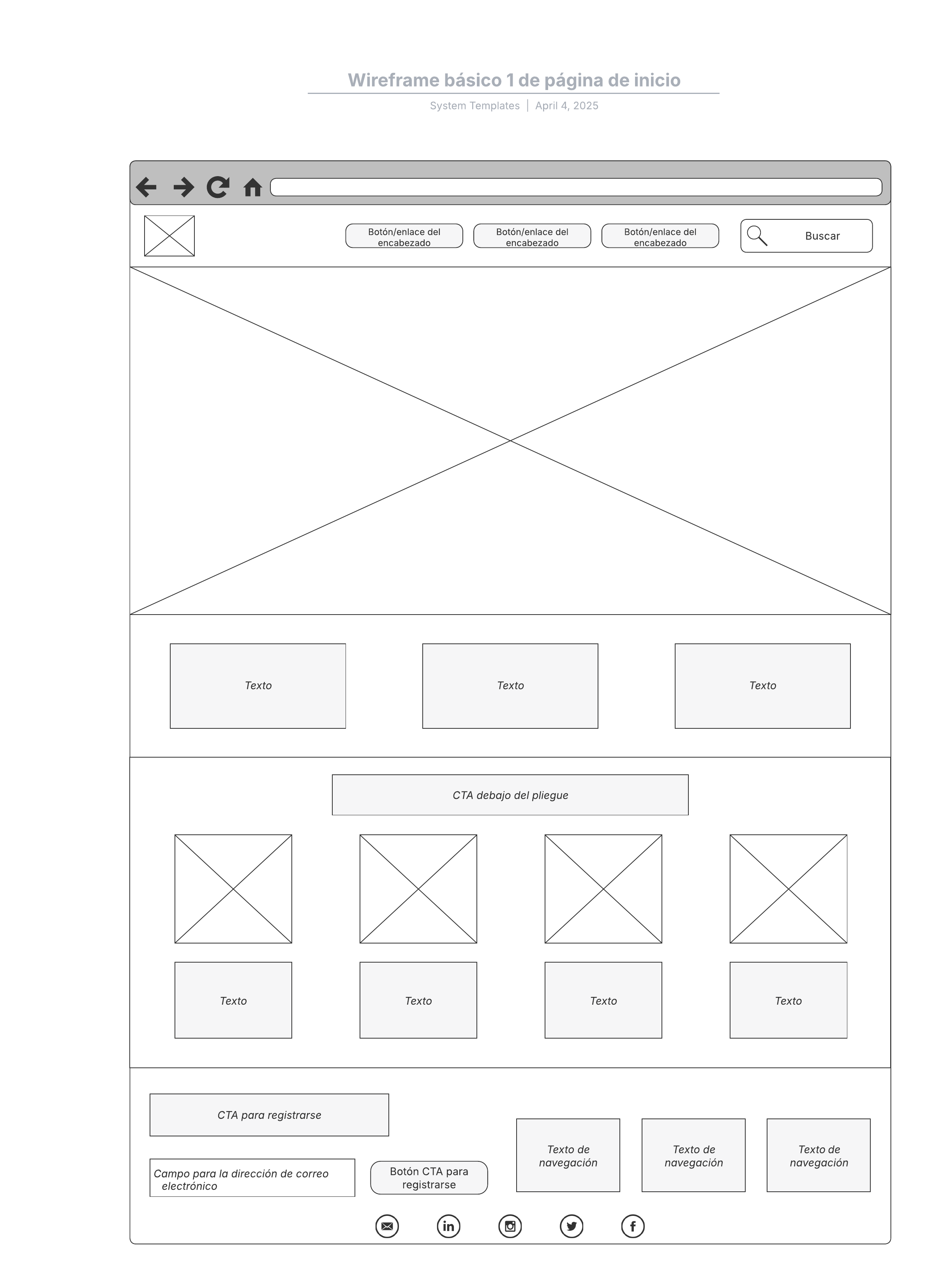 Abre esta plantilla para ver un ejemplo detallado de un wireframe básico para una página de inicio que puedes personalizar según tu caso de uso.