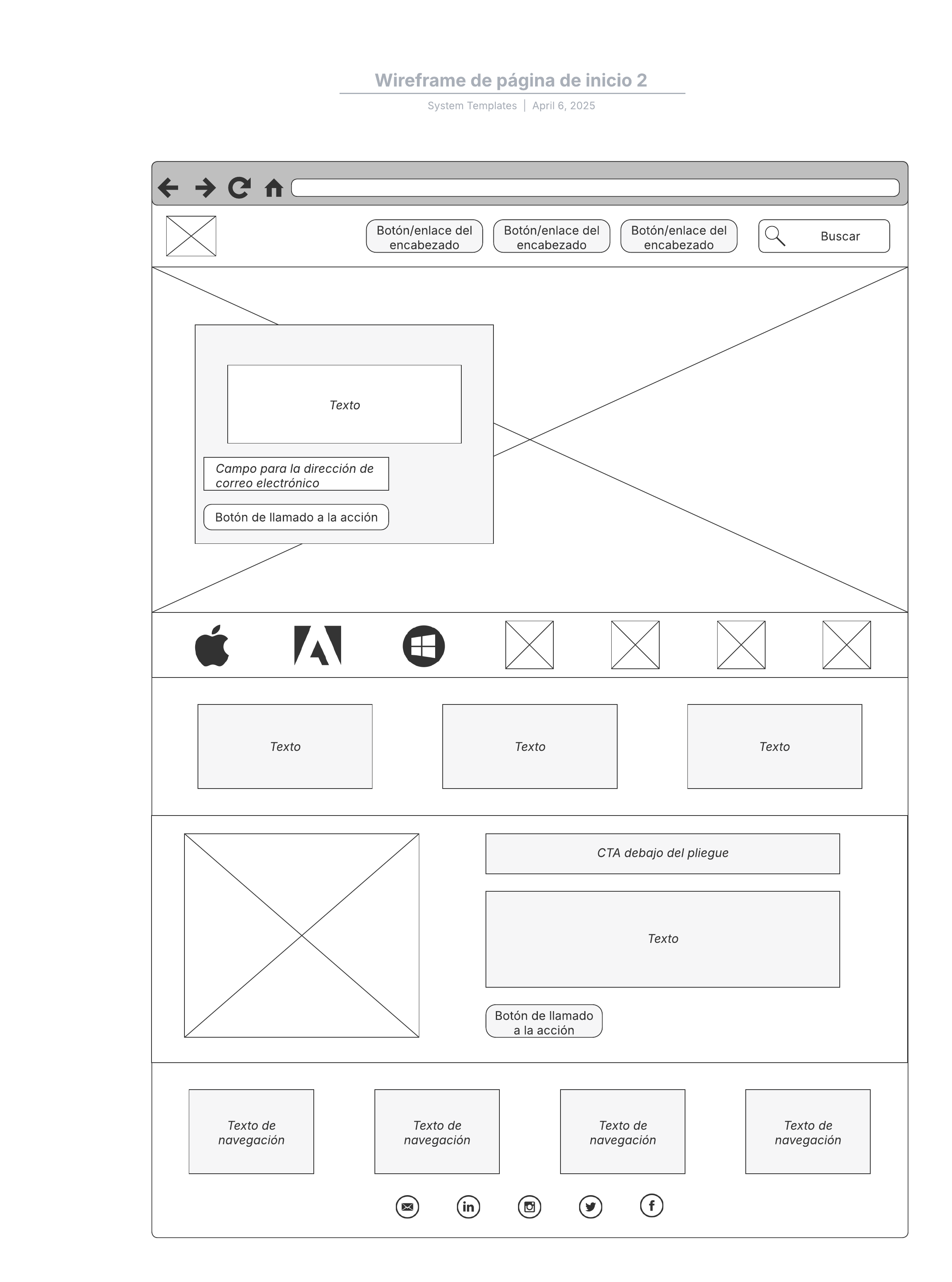 Abre esta plantilla para ver un ejemplo detallado de un wireframe para una página de inicio que puedes personalizar según tu caso de uso.