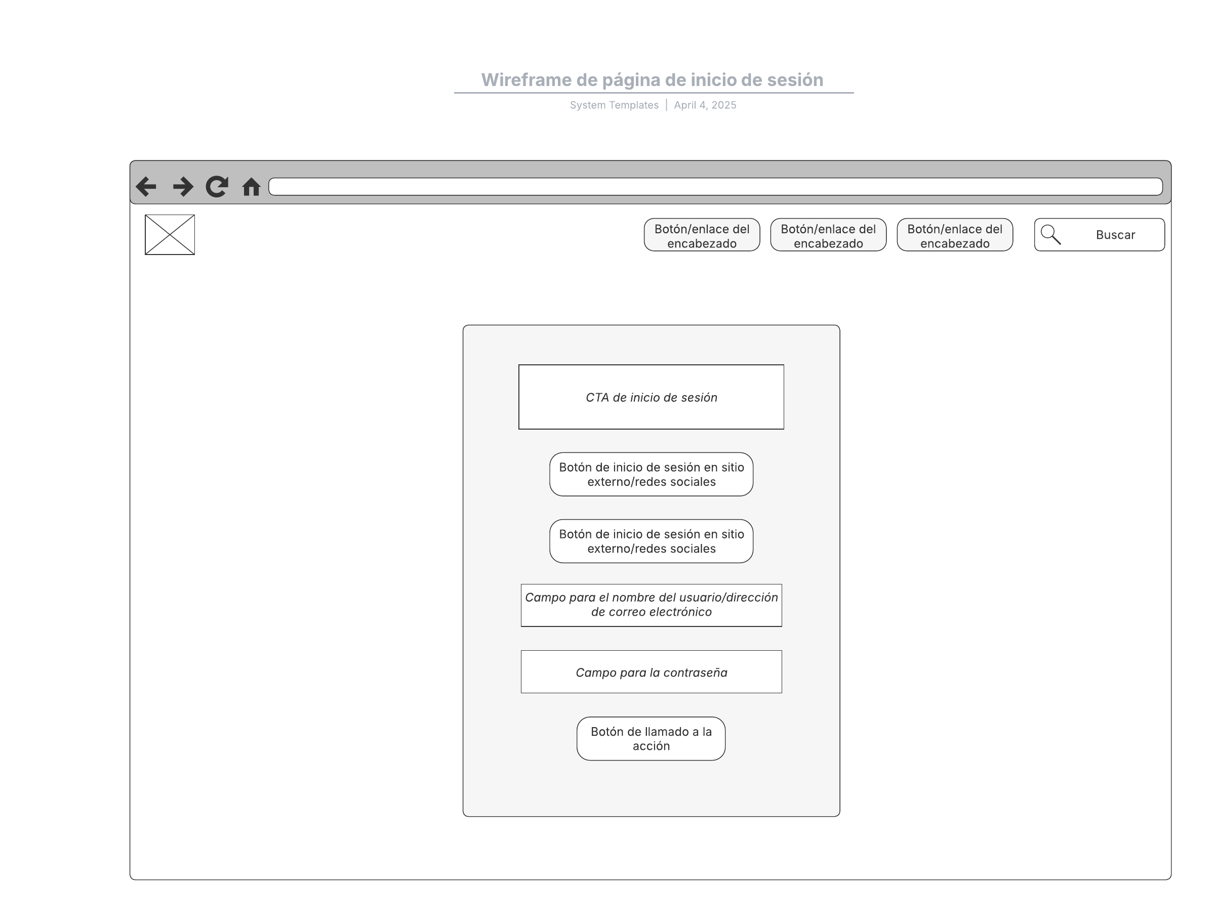 Esta plantilla básica de wireframe de una página de inicio de sesión puede ayudarte a lograr lo siguiente:
