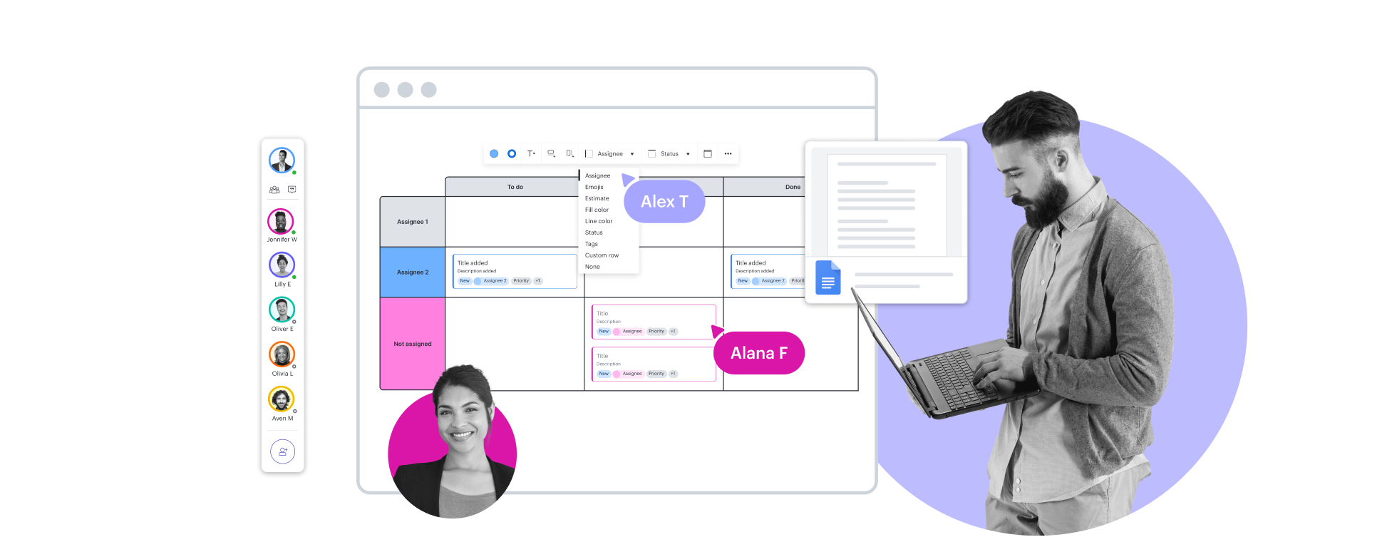 Reúne a tu equipo en tiempo real o en cualquier momento. Propón ideas, prioriza y alinea, por ejemplo, temas de contenido y de seminarios web.