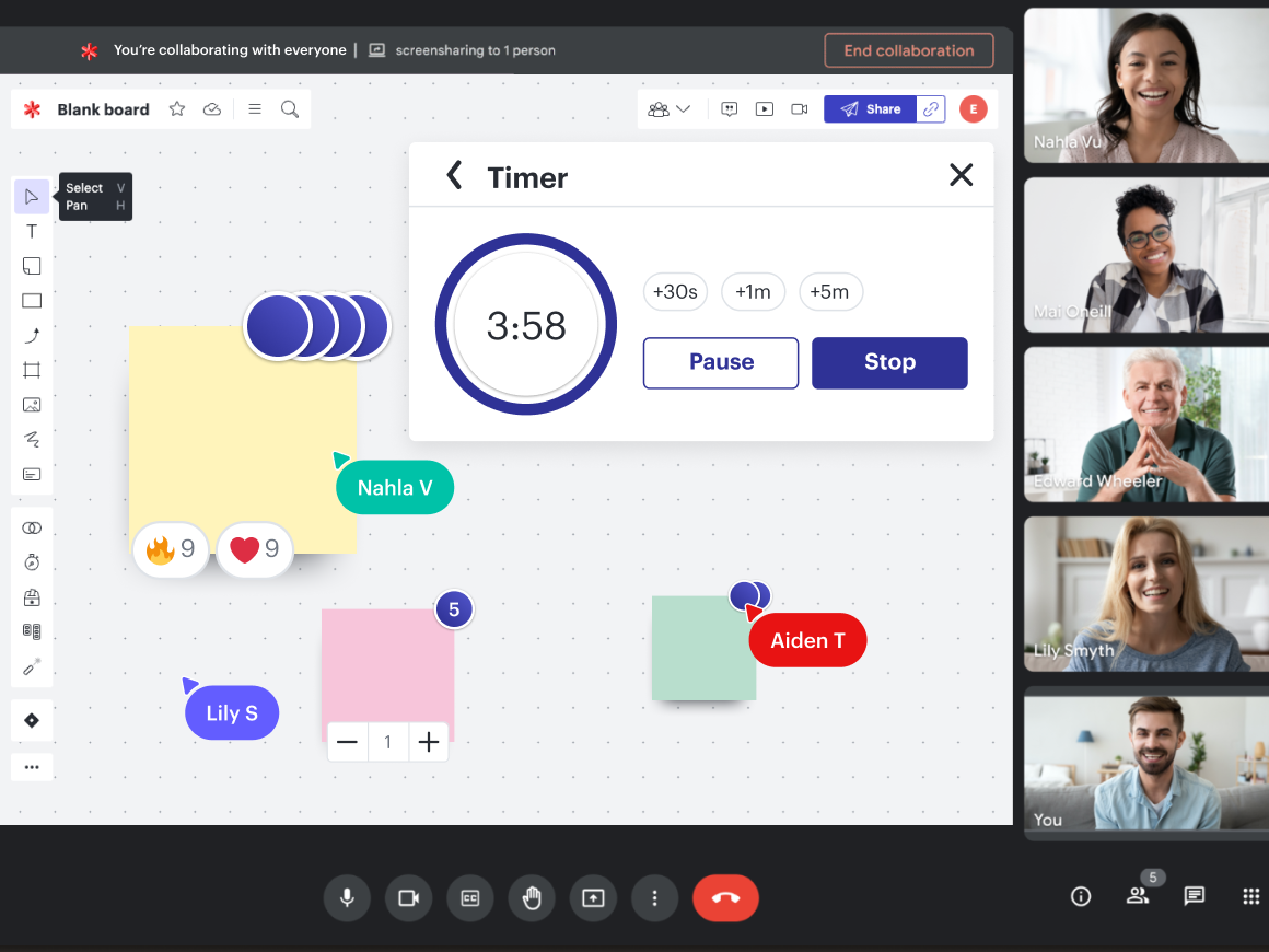 - Réduire la complexité en permettant le travail en petits comités grâce aux groupes de discussion : lancez un minuteur, partagez vos idées en petits groupes, puis revenez présenter et synthétiser vos idées avec l’ensemble de l’équipe sur le tableau principal.