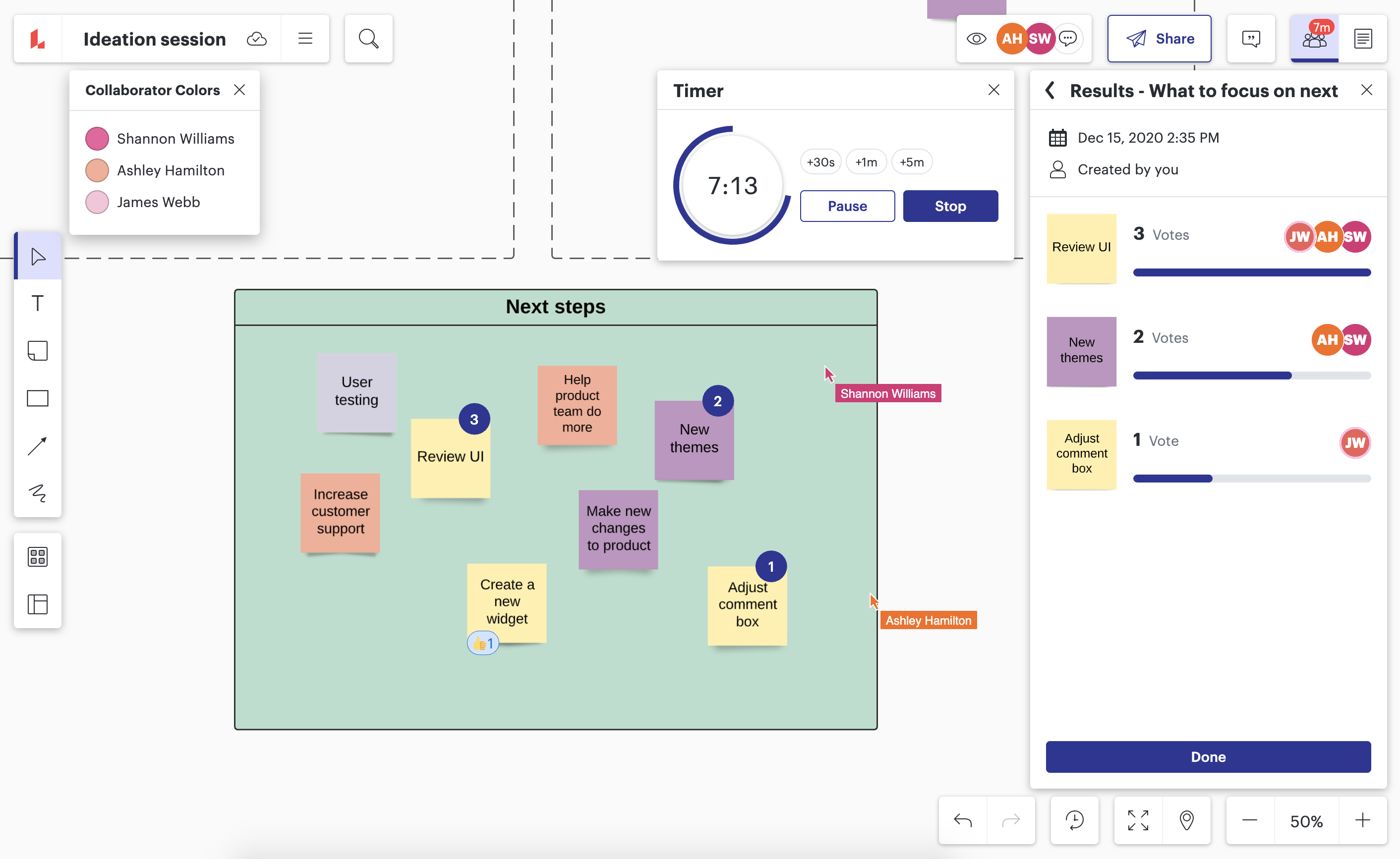 En variant le format de vos rencontres, vous offrez aux différents types de personnalités qui composent votre équipe la possibilité de prendre part aux discussions. Posez une question et faites un tour de table pour recueillir les réactions. Examinez les progrès réalisés lors d’une réunion de groupe ou d’entretiens individuels avec chaque collaborateur. Proposez des outils numériques collaboratifs tels quel Lucidspark pour permettre à votre équipe d’organiser des brainstormings efficaces, de formuler et de recueillir des commentaires ainsi que de soumettre ses meilleures idées à un vote, aussi bien au bureau qu’à distance.