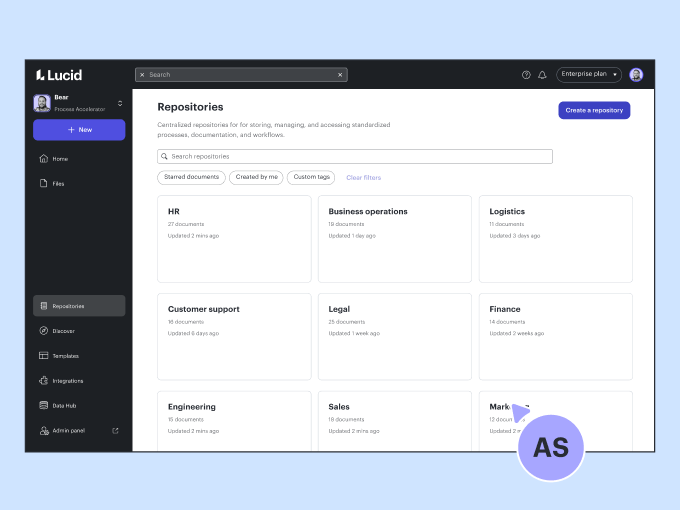 Ajoutez l’Accélérateur de processus à votre compte Lucid Entreprise pour améliorer la gouvernance et la standardisation de la documentation, du stockage et de la maintenance des processus.