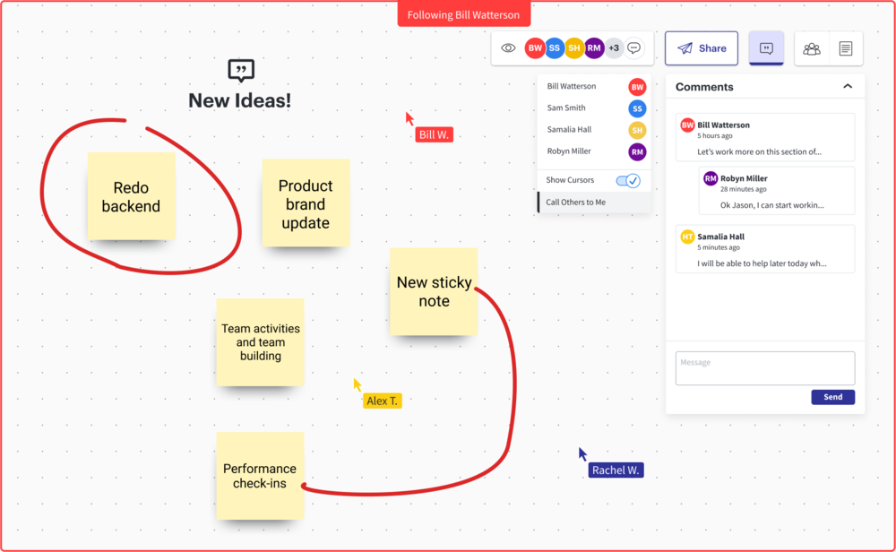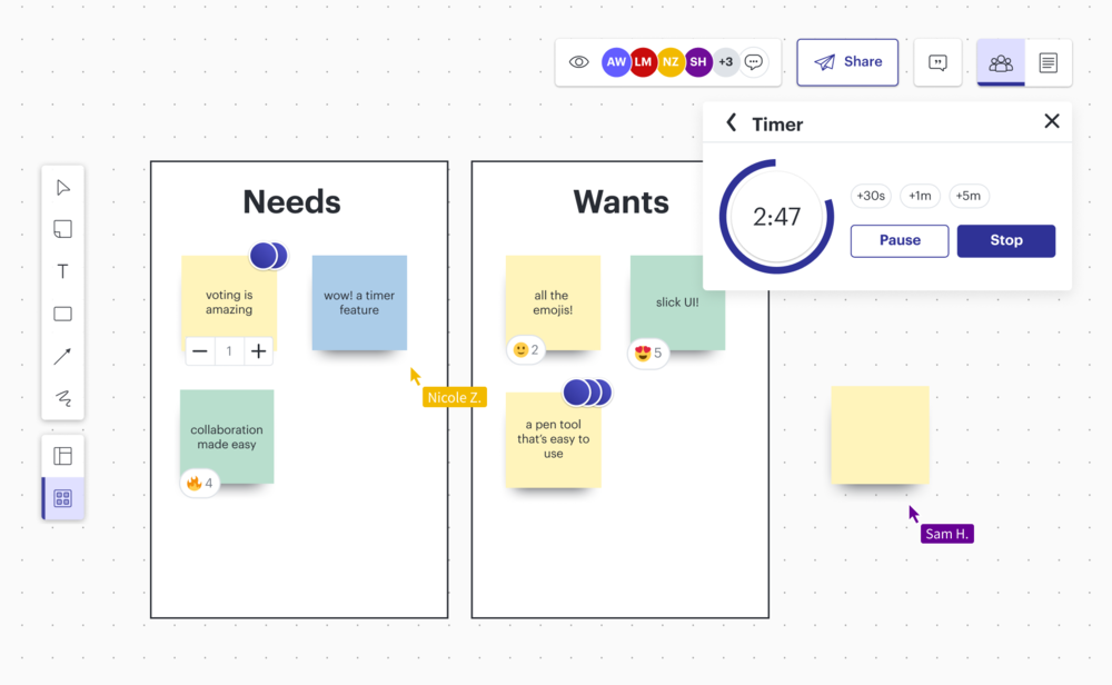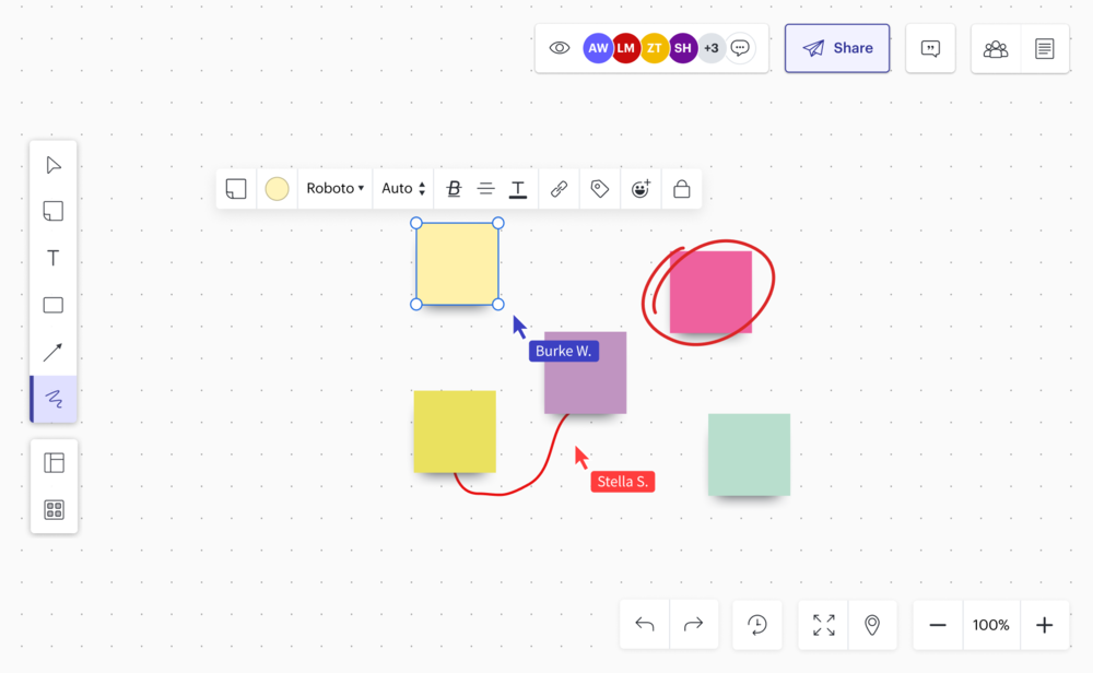 Whimsical ne propose pas de collaboration en temps réel comme le fait Lucidspark. Partagez facilement votre tableau, dialoguez en direct avec vos collaborateurs et suivez leurs contributions, et utilisez des codes couleur pour identifier précisément l’auteur de chaque modification.