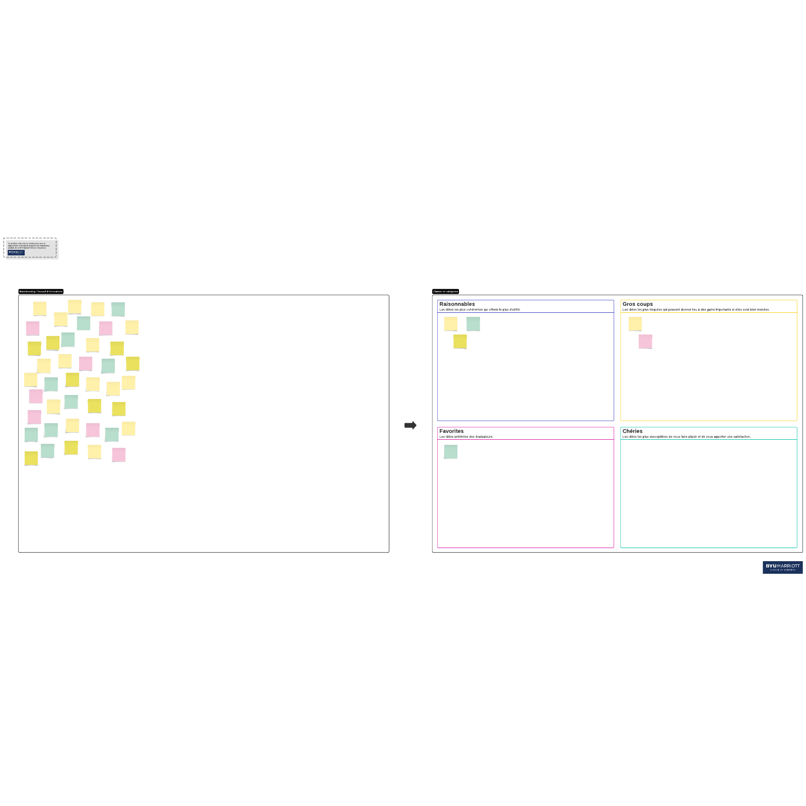 Créez un diagramme des affinités en ligne pour découvrir des informations précieuses lors de séances de brainstorming. Transformez les post-its en thèmes et en modèles grâce aux fonctions Rassembler et Trier, et utilisez le marquage pour identifier les priorités et les ressources.