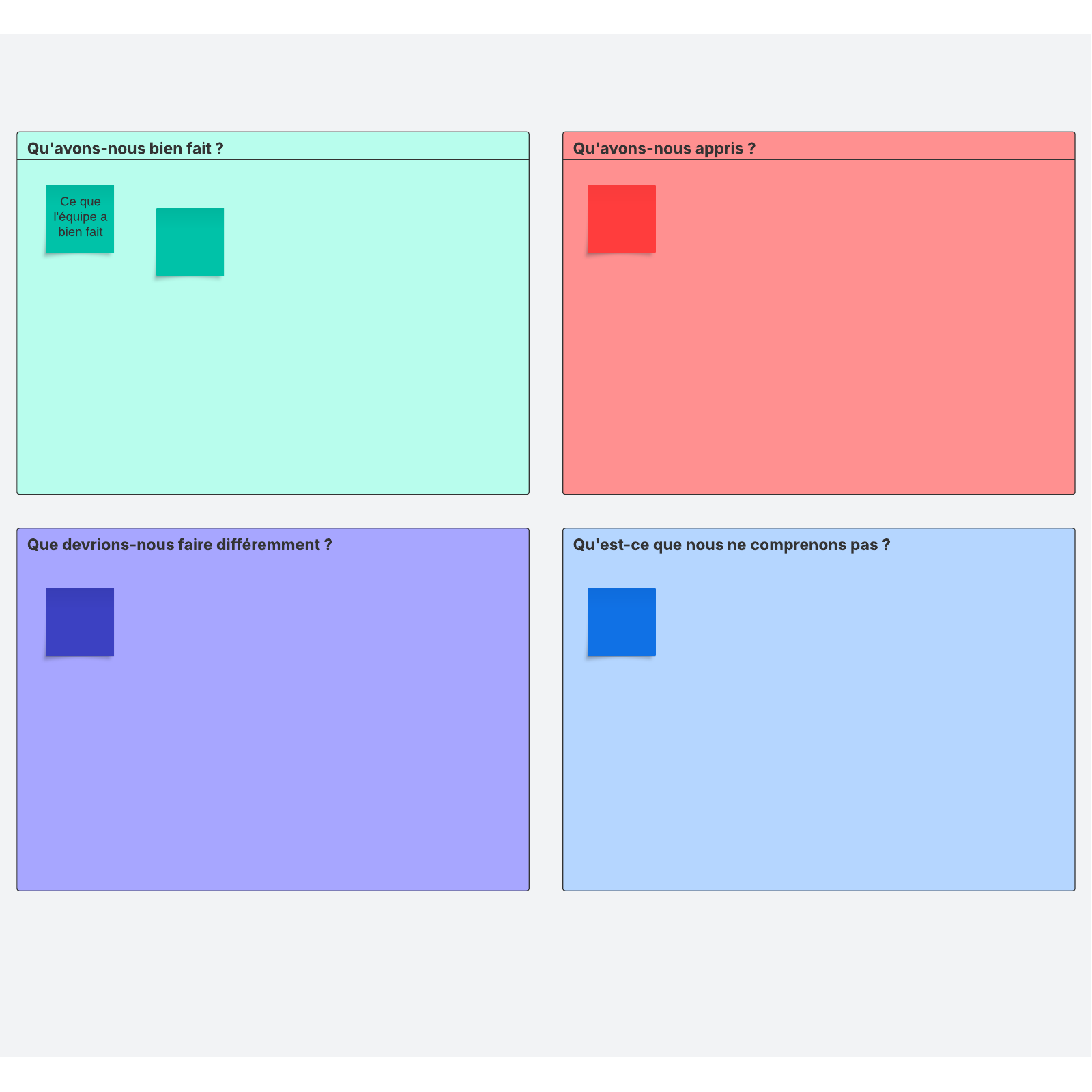 Obtenez des informations précieuses pour votre prochaine séance de planification de sprint grâce aux activités visuelles. Votez pour vos idées préférées, hiérarchisez les tâches, classez les projets par ordre de priorité et prenez le pouls de votre équipe. Ensuite, consultez et partagez les commentaires pour décider dʼune direction claire à suivre.