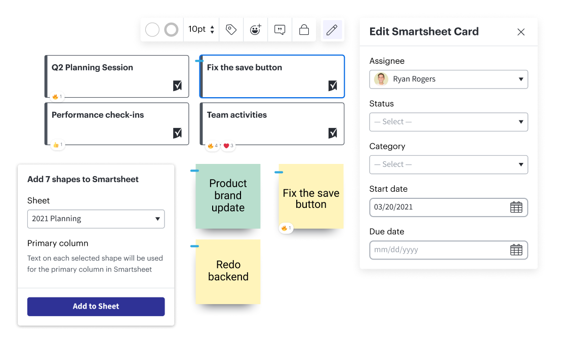 Collaborez sur notre tableau blanc virtuel et transformez vos idées en actions pour vos nouveaux projets. Convertissez facilement les formes Lucidspark en lignes sur vos feuilles Smartsheet existantes ou importez des tâches depuis Smartsheet vers Lucidspark. Actualisez vos données à la fois dans Lucidspark et dans Smartsheet grâce à la synchronisation bidirectionnelle.