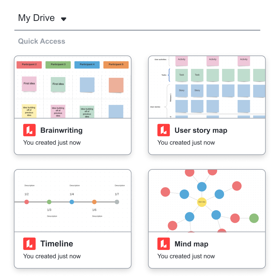 Créez, partagez et gérez tous vos tableaux Lucidspark à partir de Google Drive. Vos tableaux sont automatiquement synchronisés avec Google Drive pour que vous ne perdiez jamais votre travail.