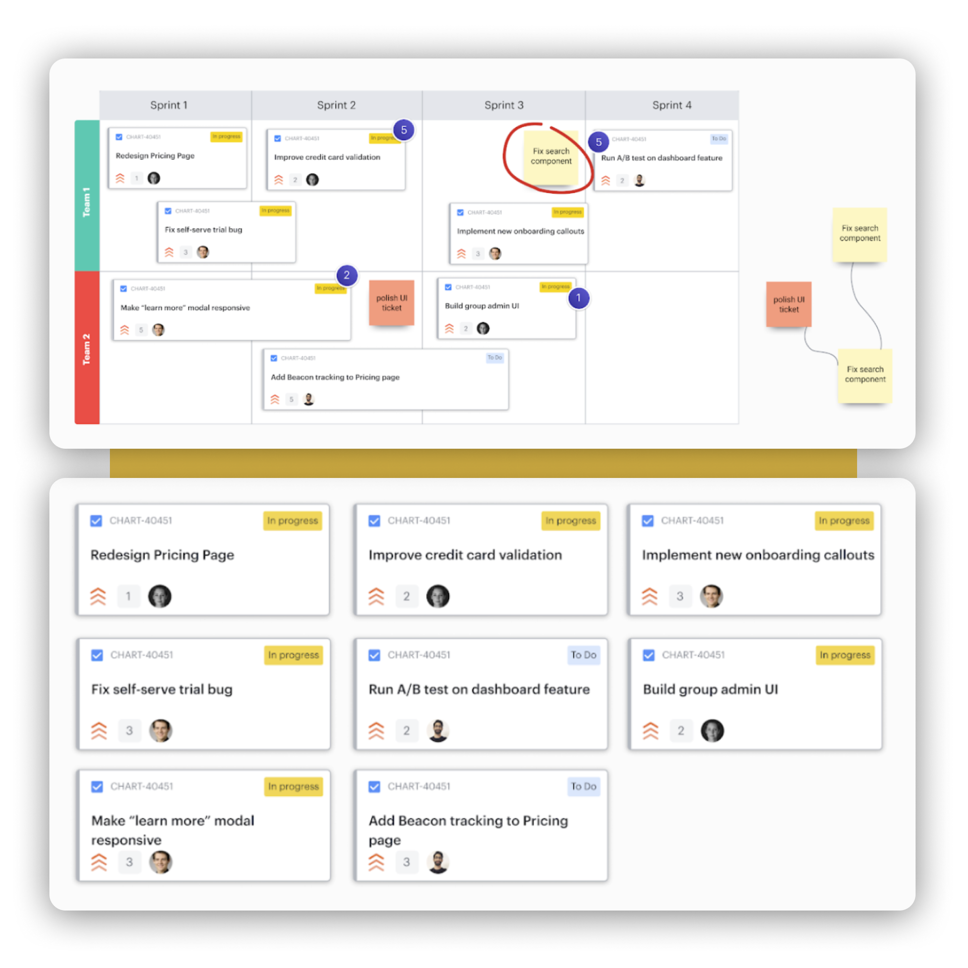 Planifiez votre travail de manière visuelle, identifiez les obstacles potentiels et obtenez une vue d’ensemble grâce aux Cartes Lucid pour Jira. Importez des tickets depuis Jira, ou faites un brainstorming à l’aide de post-its dans Lucidspark et convertissez-les en tickets Jira.