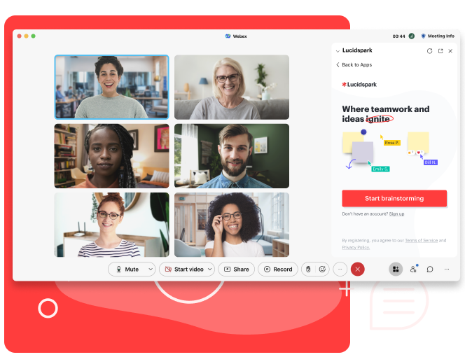 Collaborez, trouvez des idées et concrétisez-les sur la zone de travail illimitée de Lucidspark, le tout directement dans votre appel vidéo Webex. Renforcez les capacités de votre équipe hybride en lui permettant de planifier, de concevoir, de documenter et de décider des étapes à suivre sans jamais quitter Webex.