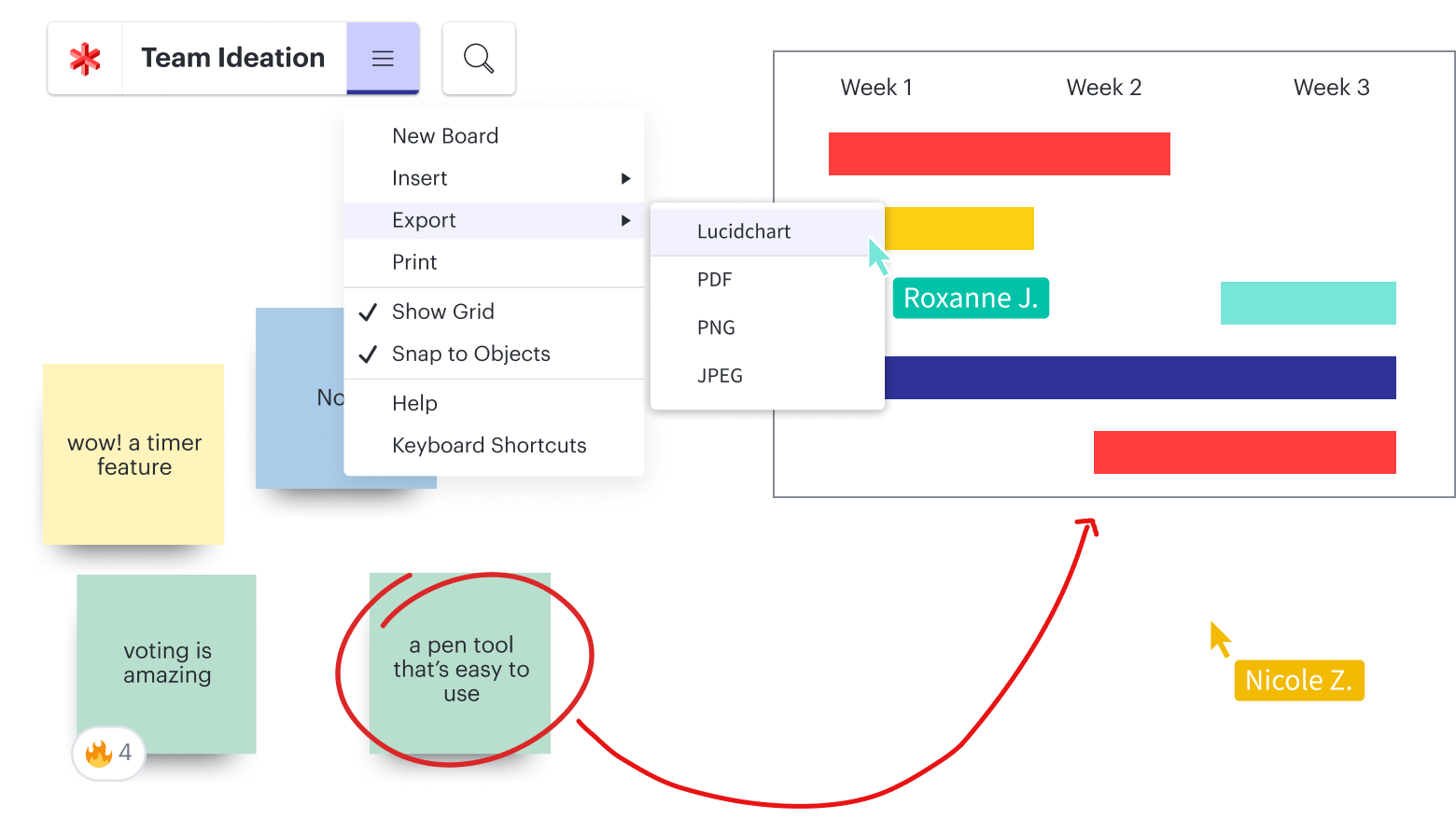 Lorsqu'il est temps d'officialiser vos plans, de les mettre en œuvre et de suivre votre avancement, exportez vos tableaux Lucidspark dans Lucidchart afin de créer une documentation soignée que vos équipes pourront consulter et partager.