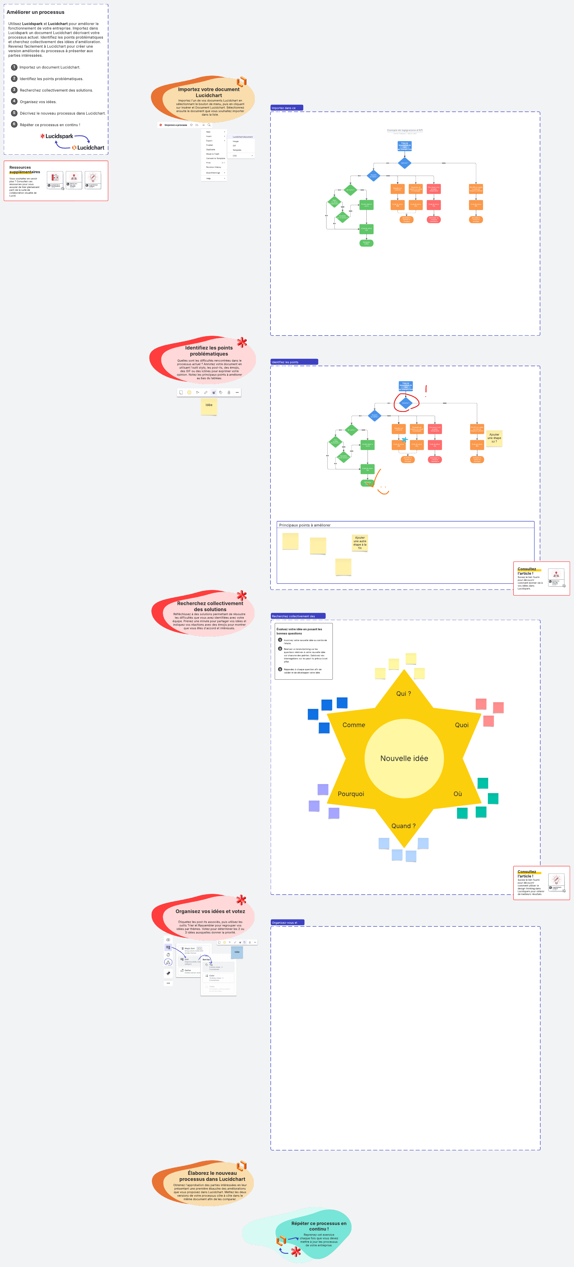 Utilisez la Lucid Suite (Lucidspark et Lucidchart) pour améliorer un processus existant. Tout d'abord, importez un schéma du déroulement du processus actuel créé avec Lucidchart. Ensuite, identifiez les domaines problématiques et réfléchissez aux idées d'amélioration de Lucidspark. Revenez facilement à Lucidchart pour créer une nouvelle version améliorée du processus à présenter aux parties intéressées.